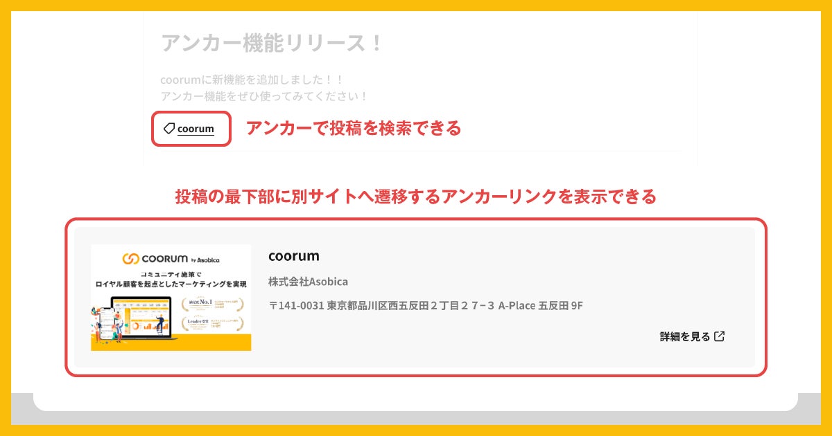 コミュニティ内の投稿に任意の関連リンクを、目を引く「アンカー(バナー形式の表示のこと)」として紐づけることができる