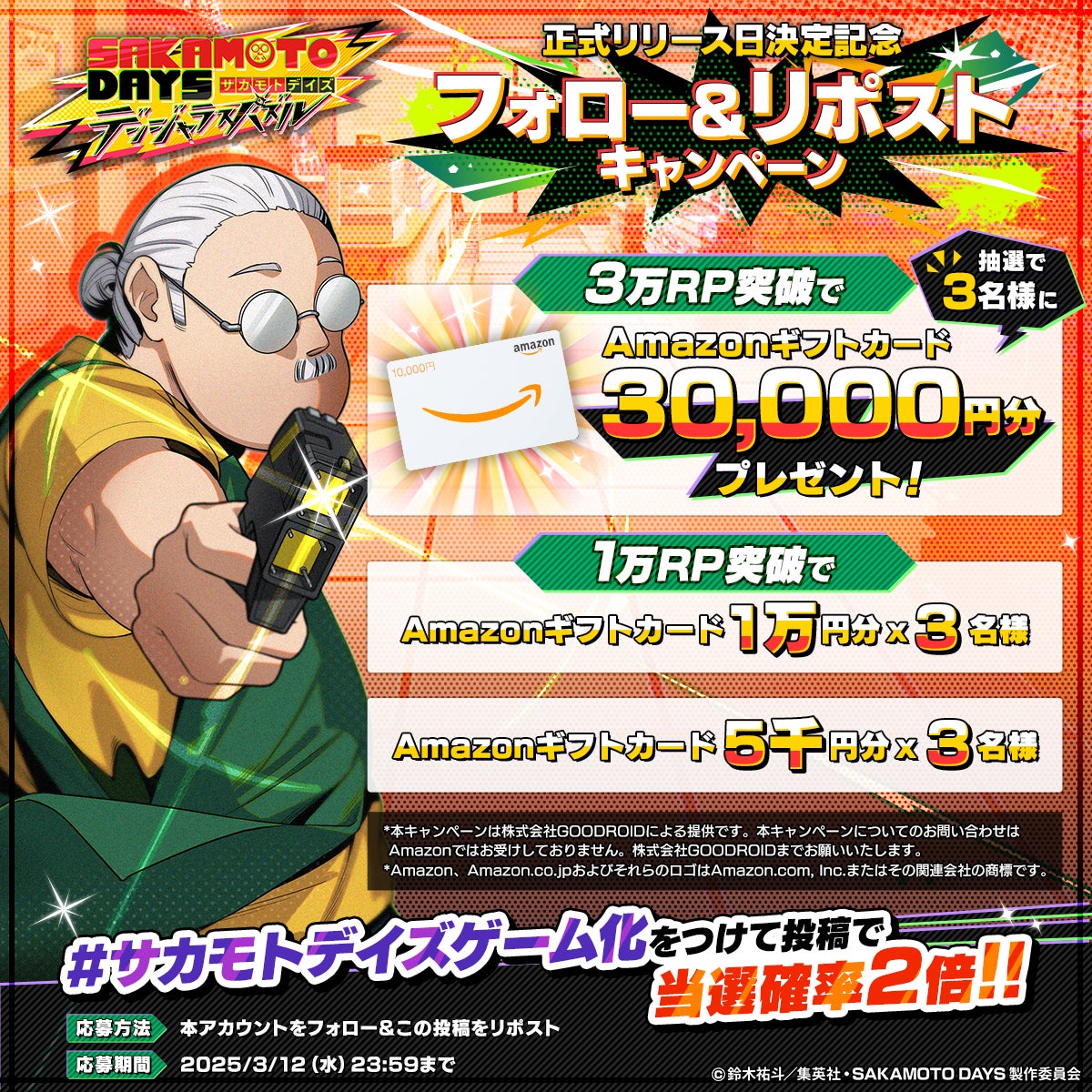 株式会社サイバーエージェント(本社:東京都渋谷区、代表取締役:藤田晋、東証プライム市場:証券コード4751)の連結子会社である株式会社GOODROID(本社:東京都目黒区、代表取締役社長:松田和彬)は、企画・制作・開発・運営を行うスマートフォン向けゲームアプリ『SAKAMOTO DAYS デンジャラスパズル』(以下、『サカパズ』)の2025年4月2日配信を記念した、プレゼントキャンペーンの実施を決定いたしました。