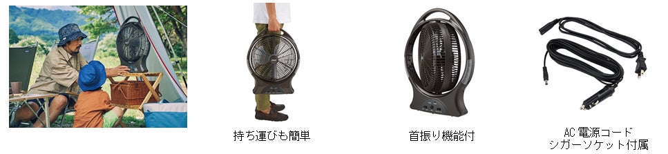 様々なアウトドアシーンで活躍する充電式の扇風機です。直径39cmの大きなサイズでも重さは約1.9Kgなので手軽に持ち運ぶことができます。充電式電池の他、AC電源、車のシガーソケット(DC電源)の3種類から電源を確保することできるので、屋内、屋外両方で使用可能です。左右の首振り機能、暗いテント内でも明るく照らすLEDライト付です。連続可能使用時間はHighモードで約4.5時間、Lowモードで約8時間、LEDモードで約39時間です。