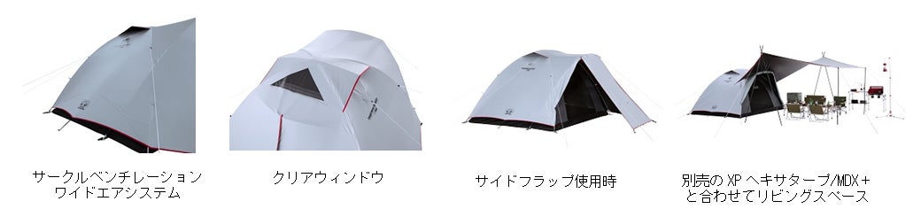 アシストクリップを使用して、ポールを固定しながら建てるので、設営が簡単です。クロスフレーム構造を前室だけでなく、寝室にも採用することで高い天井と広い室内空間を確保するだけでなく、強風にも負けない剛性を持たせる構造になりました。LDX+とMDX+の2サイズの展開です。