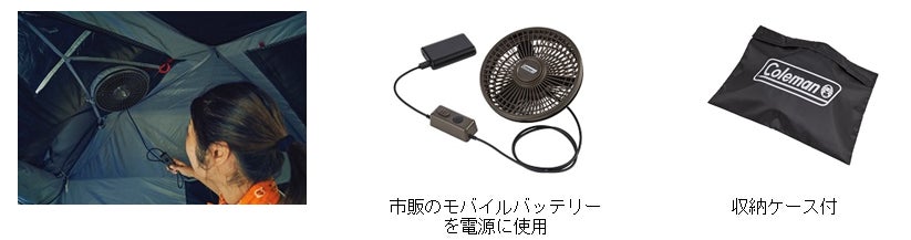 専用テントに装着することで外気を取り込み、こもった熱や湿気を排出します。羽の回転が前後で選べるリバーシブル仕様で、風を外向きに設定すると自然な風の流れを作り睡眠時の温度や湿度上昇を抑え、風を内向きに設定すれば、空気循環を促しテント内に気流を作り風の力でより涼しい空間を作ることが可能です。電源は市販のモバイルバッテリー対応です。連続作動時間(電源容量10,000mAh時)はHighモードで約6.5時間、Lowモードで約9時間です。