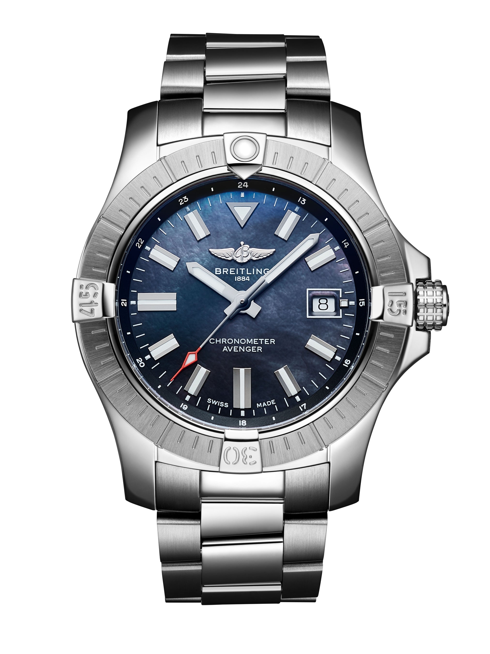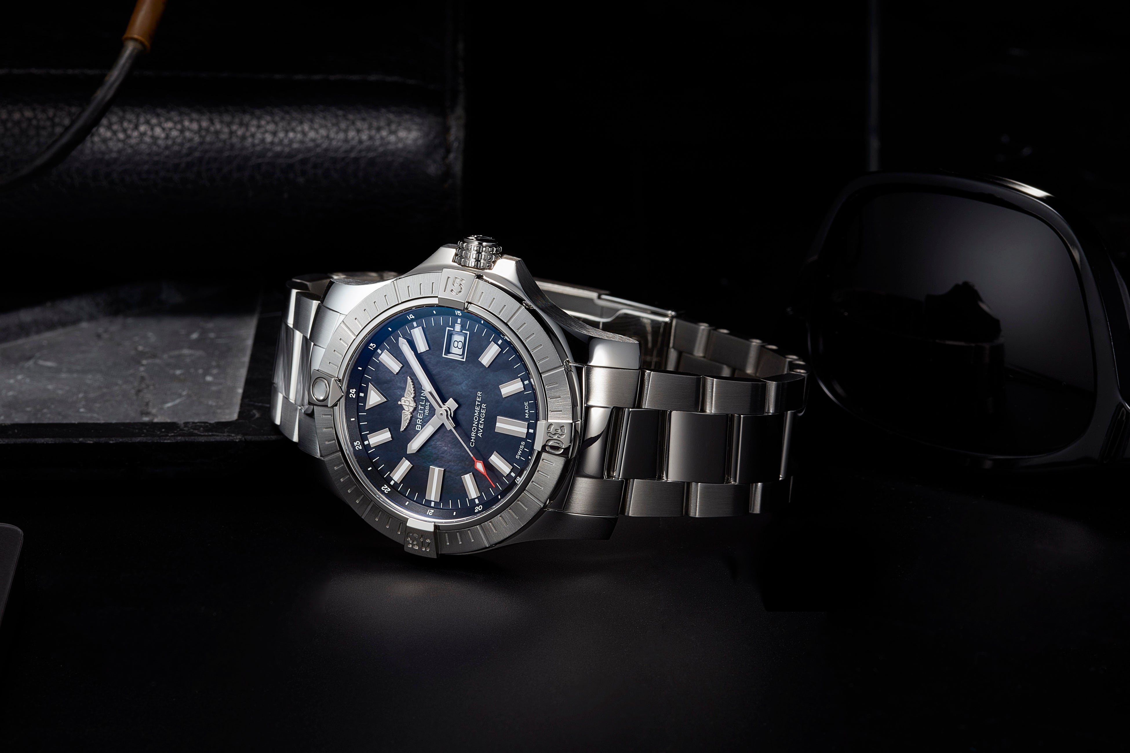 アベンジャー コレクションのなかでも、視認性が高くすっきりとしたダイヤルが特徴のアベンジャー オートマチック 43。本作は、ダイヤルにブラック マザー オブ パールを採用した日本だけの特別なモデル。真珠母貝の文字盤は、その唯一無二の美しさから日本では常に高い人気を誇るディティールです。センターには時針・分針、赤いカラーがアクセントの秒針が、3時位置には日付窓が配されています。頑丈なステンレススチール製43 mmケースはラチェット式逆回転ベゼルを装備。内部ではブライトリング キャリバー17、パワーリザーブ約38時間の自動巻ムーブメントが脈打ちます。インデックスと針にはスーパールミノバ®蛍光塗料が塗布されているため、どんな環境でも読み取りやすくなっています。この希少な日本限定モデルは、100本のみの限定販売で、ケースバックにはONE OF 100と刻印されています。