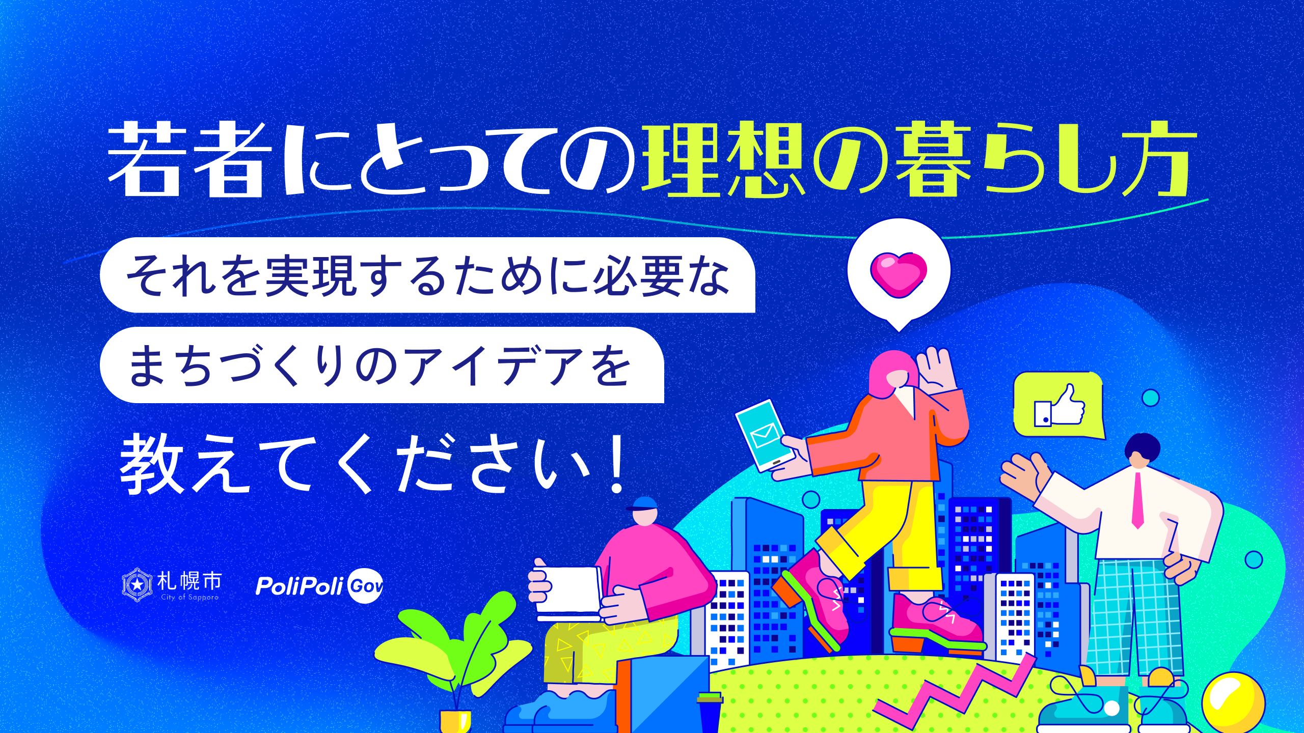 札幌市の人口はこれまで増加傾向にありましたが、合計特殊出生率の低下や若年層の転出超過により、近年減少に転じ、今後は更なる減少が見込まれています。そこで、若者の理想の暮らし方が実現できるアイデアを募集し、今後のまちづくりに生かしていくため、PoliPoliGovを用いた意見募集を実施します。