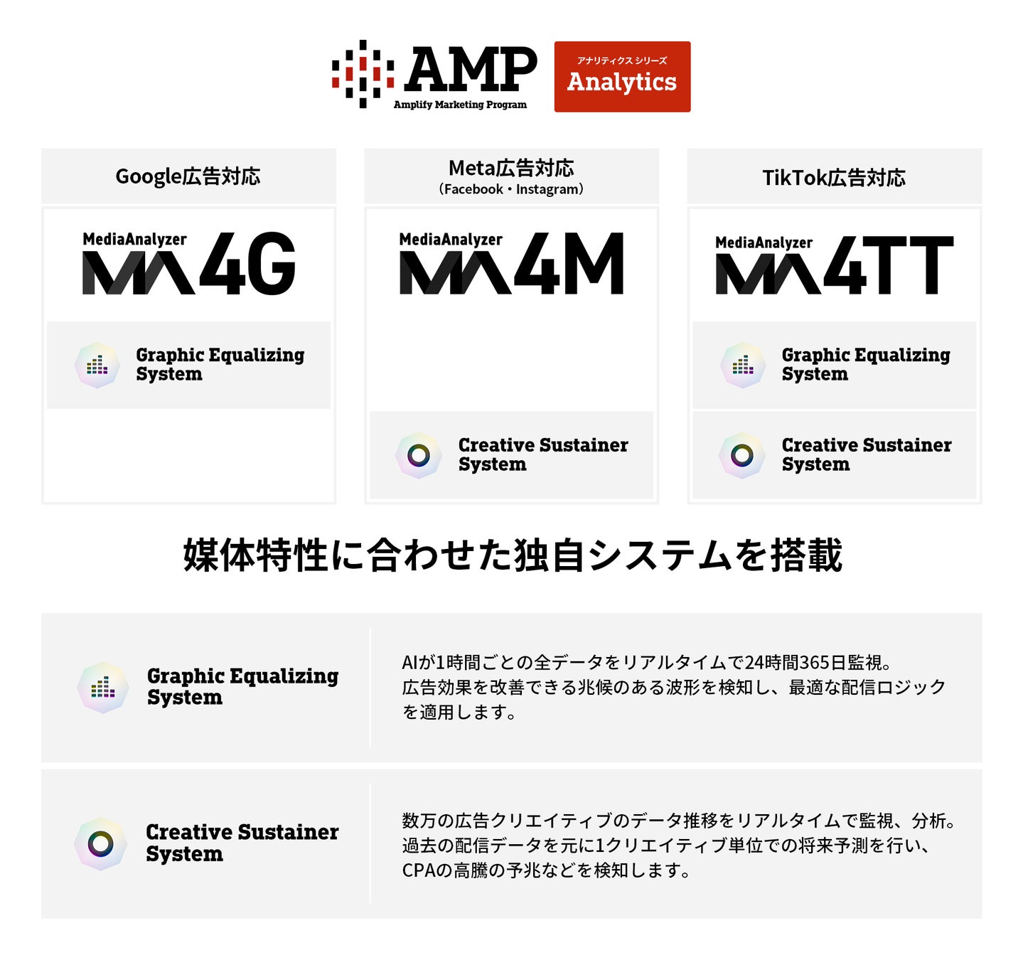 TikTok広告の最適化に特化した「MA4TT」は、Google広告に特化した「MA4G」、Meta広告に特化した「MA4M」に続く、「AMPメディアアナライザー」シリーズ第3弾となります。