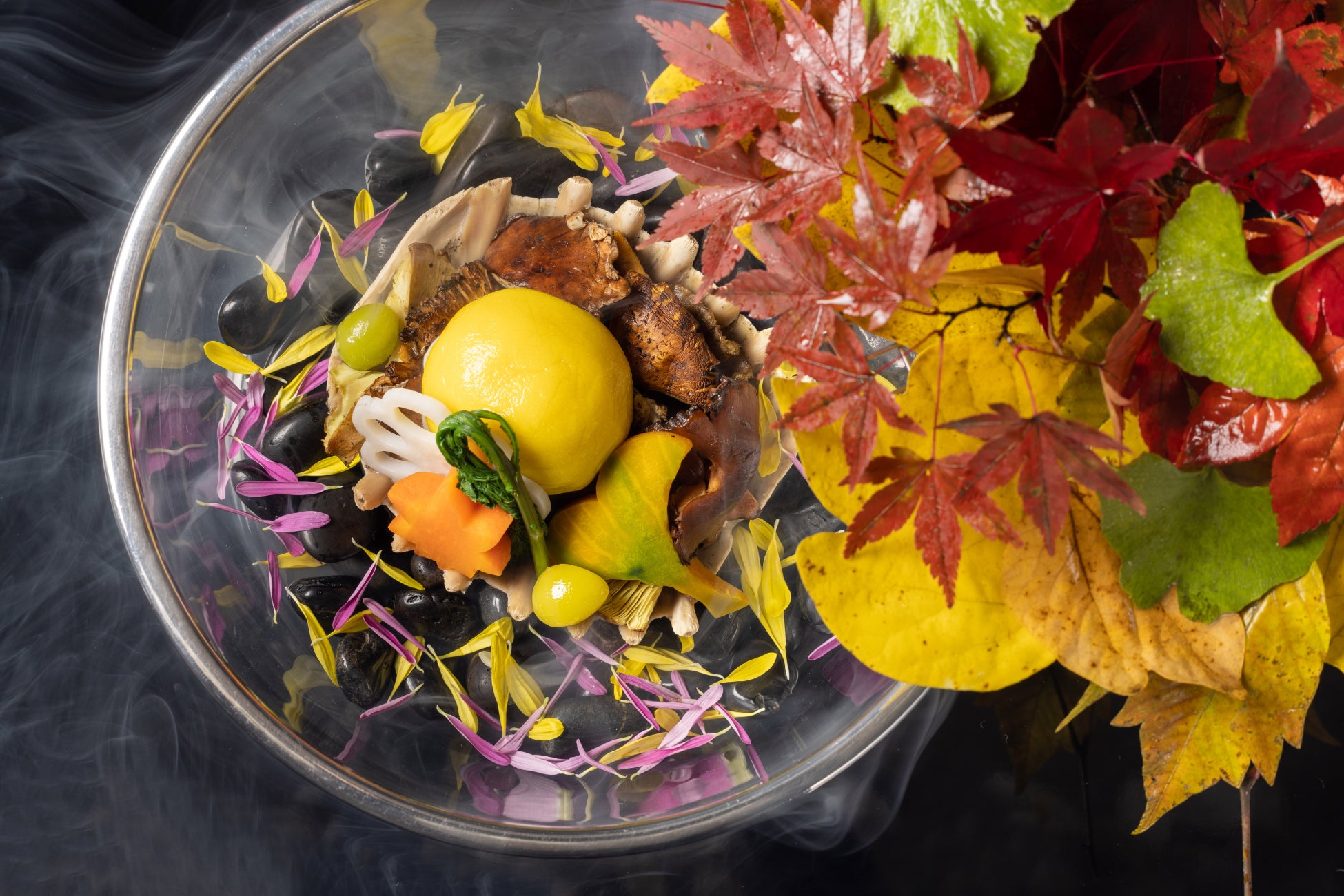 例えば、鼈(すっぽん)の甲羅の上に、丁寧に炊かれた数種類の茸と、月を模した鼈饅頭(すっぽんまんじゅう)を盛りつけた強肴「月と鼈(すっぽん)」を提供します。また、料理に合わせて、月の下でしか咲かない月下美人の花の酵母を使用した「積善 純米酒 月下美人の花酵母×ワイン酵母」を用意します。食事を堪能しながら、雲の流れや月の位置によって、刻一刻