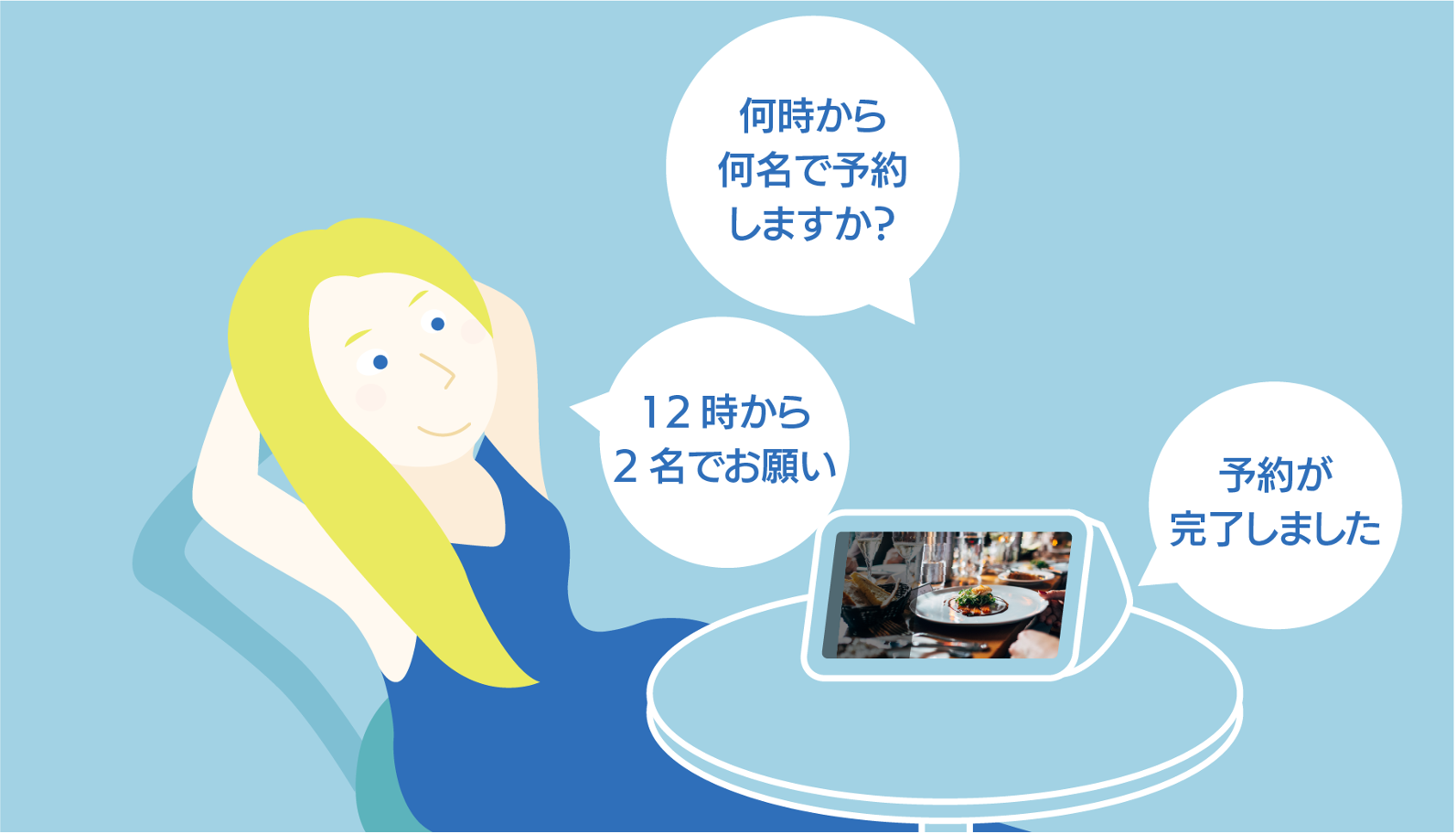 ※AIスピーカーのみならず、タブレット・TV・スマートフォン・プロジェクター等がお勧めするレストラン、アクティビティー、観光地等を、質問に答えるだけで、スマートに予約可能です。
