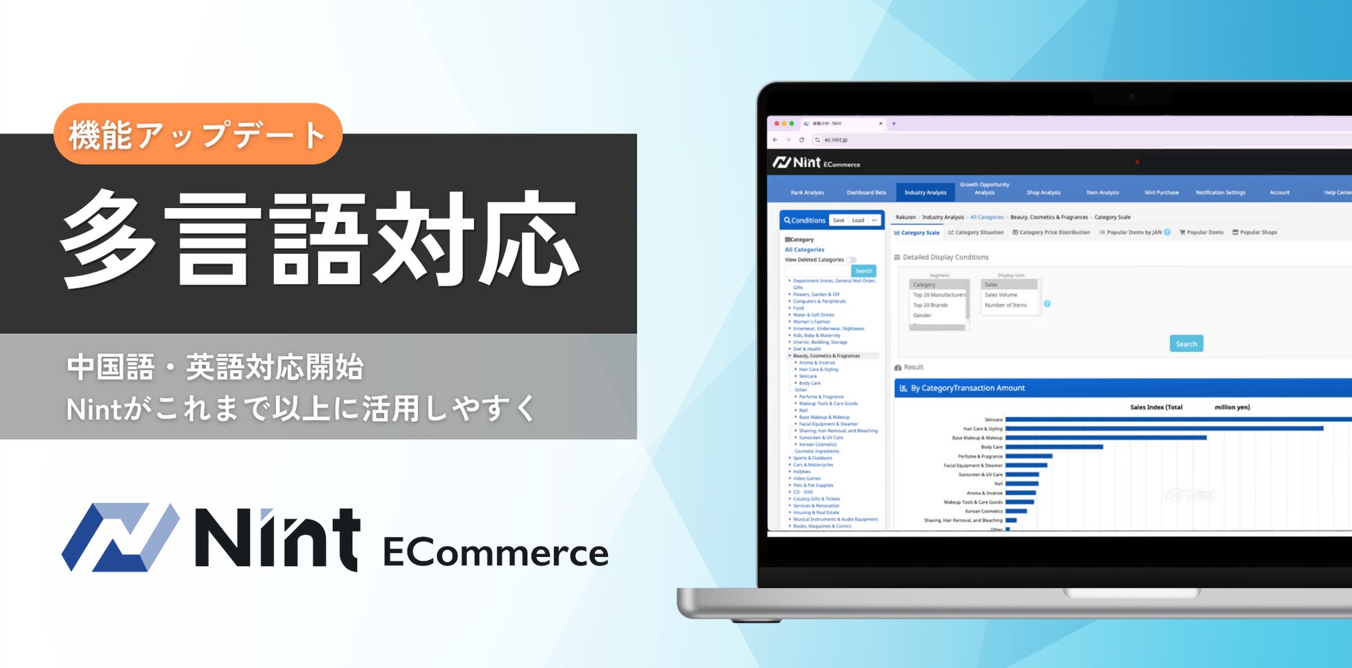 「データの価値、人の可能性が輝く世界」をビジョンに、国内大手ECモールの市場動向データ分析ツール「Nint ECommerce」(https://www.nint.jp/ec/)を提供する株式会社Nint(本社:東京都新宿区、代表取締役:吉野順子 以下、「Nint」)は、Nint ECommerceにおいて、中国語および英語対応を2024年11月15日より開始しました。日本のEC市場データを多言語で簡単に利用でき、海外企業も戦略的にECデータ活用を進められるようになります。