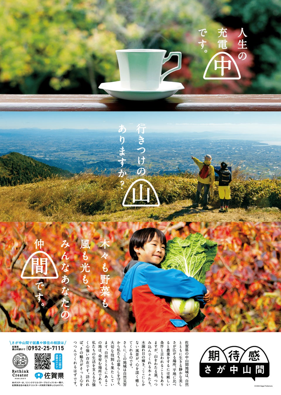 一般の方は「中山間」というワード自体に馴染みがないことに着目し、レジャーとして中山間地域と触れ合う人と将来的に移住や就農を視野に入れている人の2者のターゲットを設定しました。「中山間」という言葉を印象付けるように、「中」「山」「間」の一文字ずつ用いたキャッチコピーを佐賀県内で撮影した印象的な写真とともに配置しています。