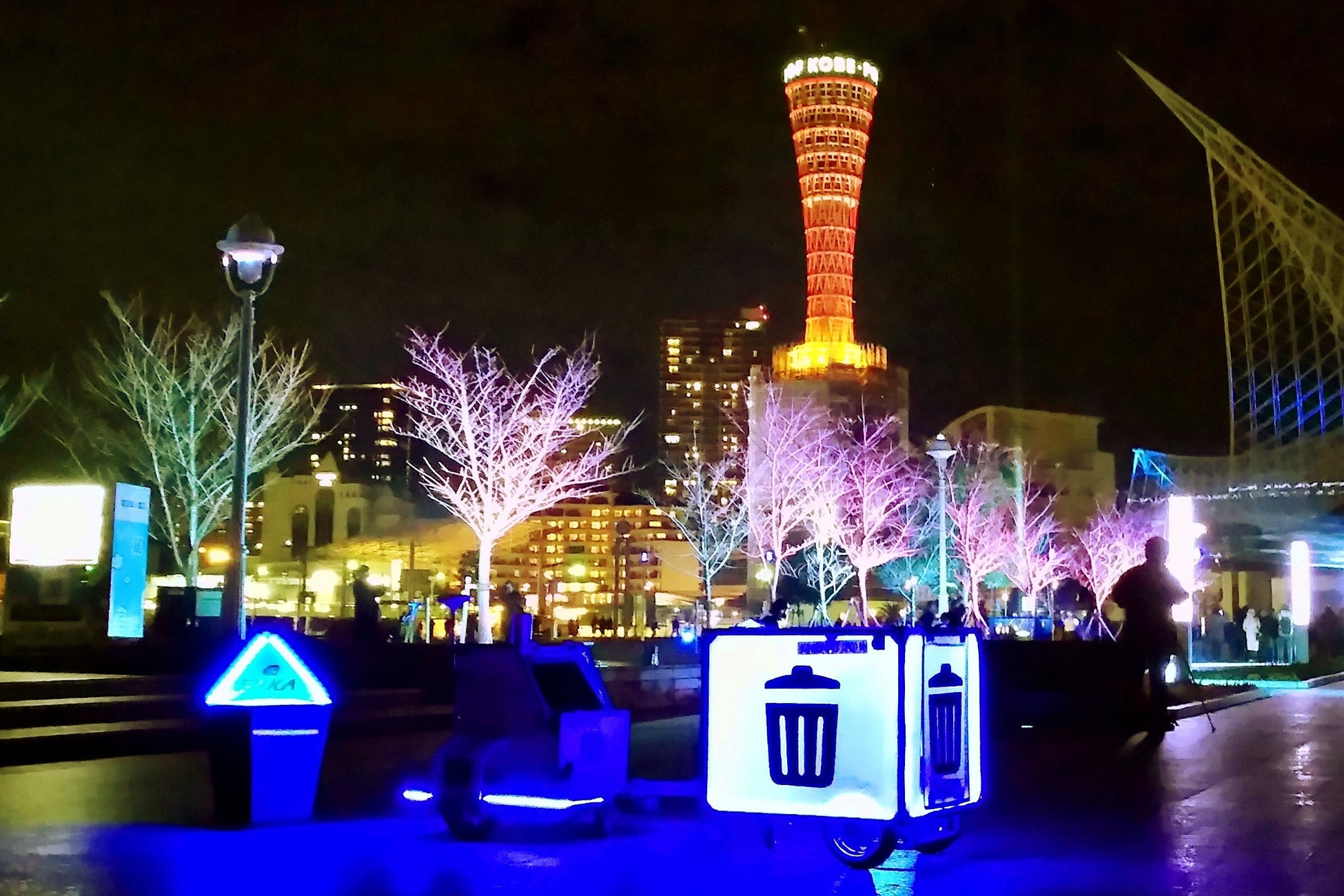 電飾を施した可愛いロボットがごみ箱を牽引して、公園の美化活動に貢献します。