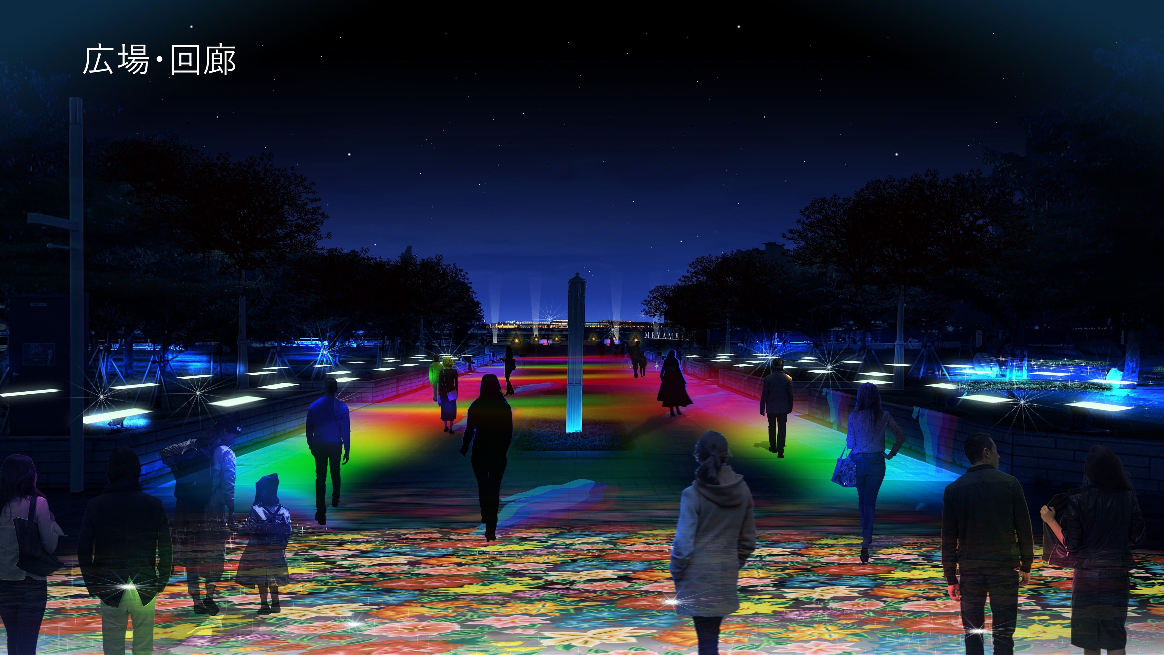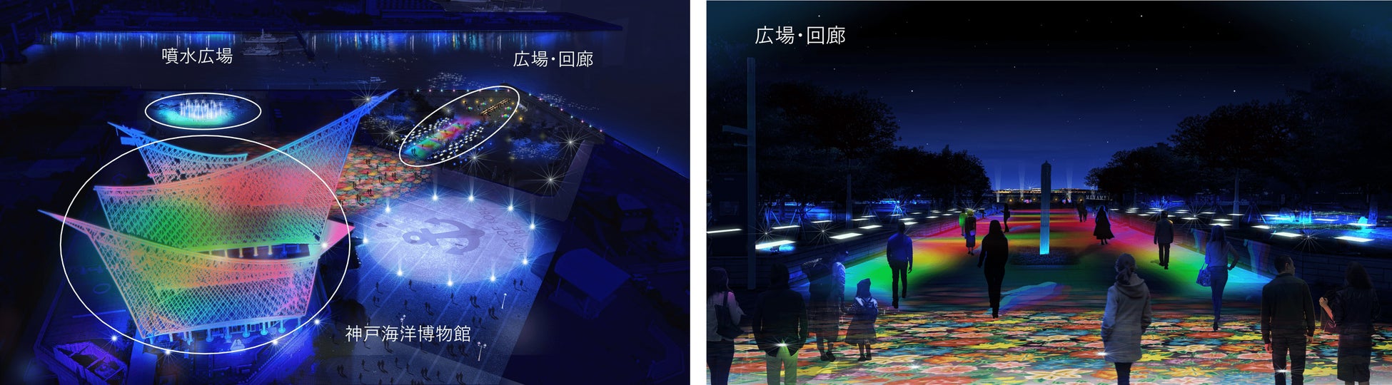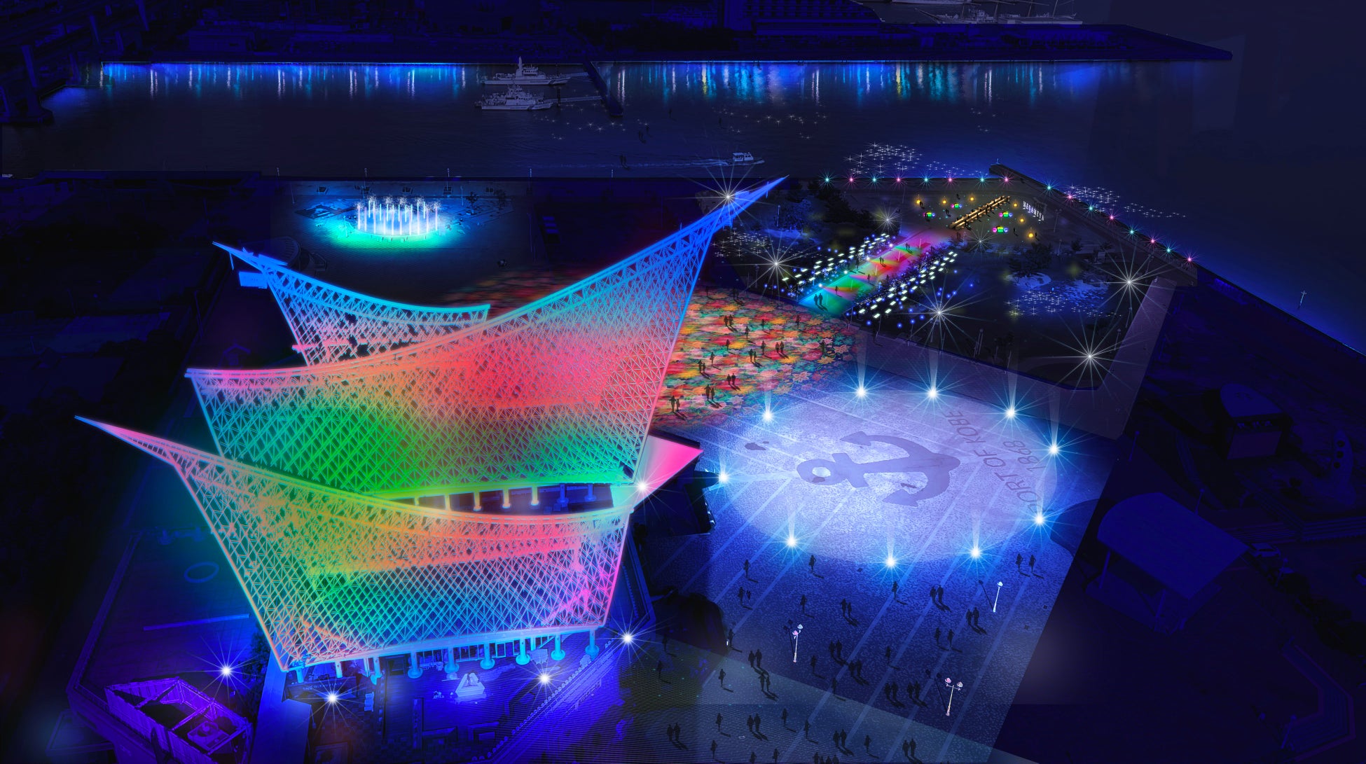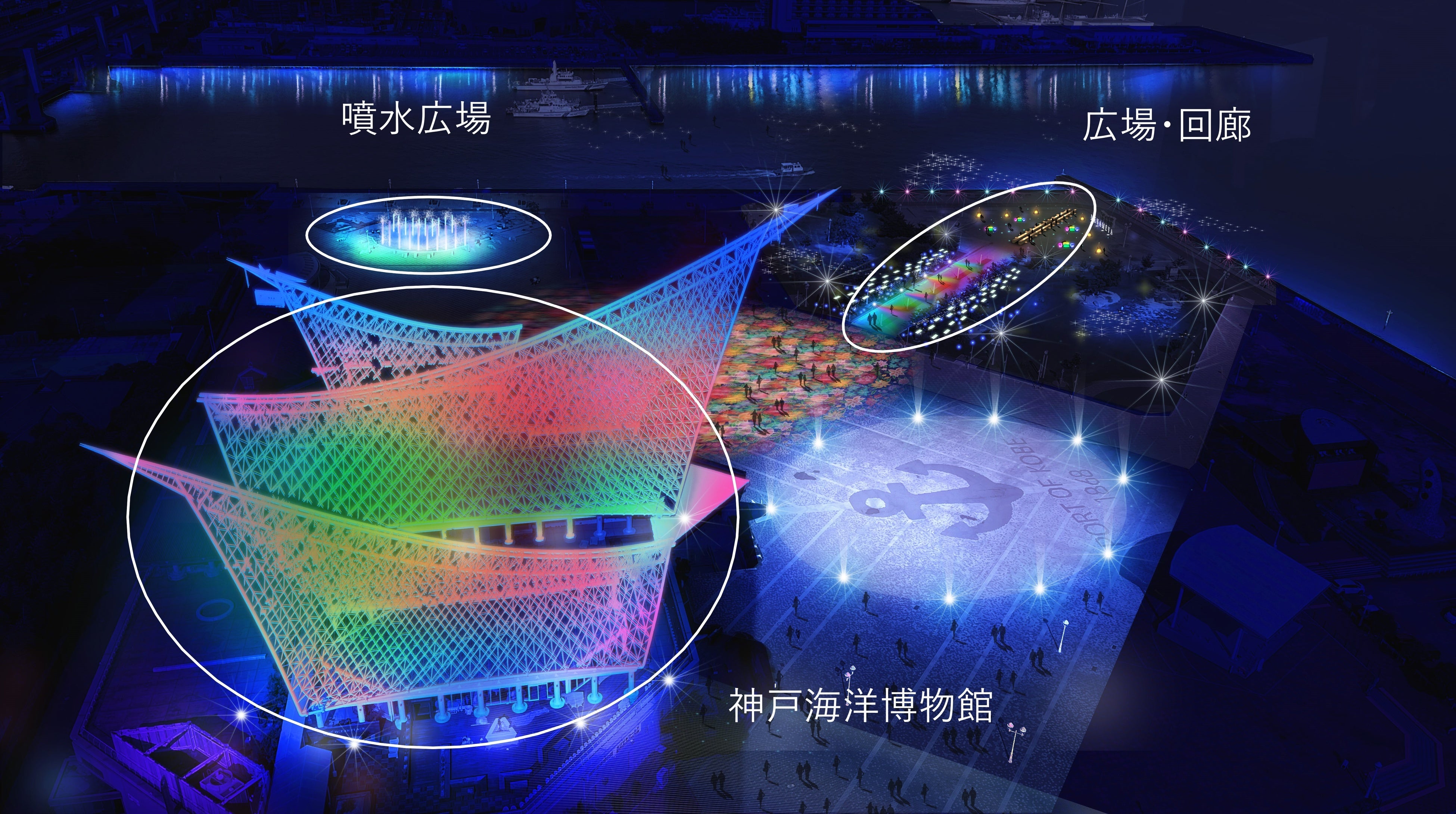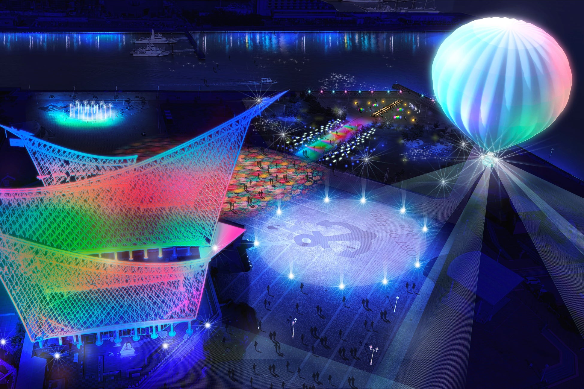 海洋博物館の屋根を、色彩豊かな様々な人が表現しながら曳かれる「だんじり」に見立て、特別なイルミネーションによりカラフルに揺らぎます。