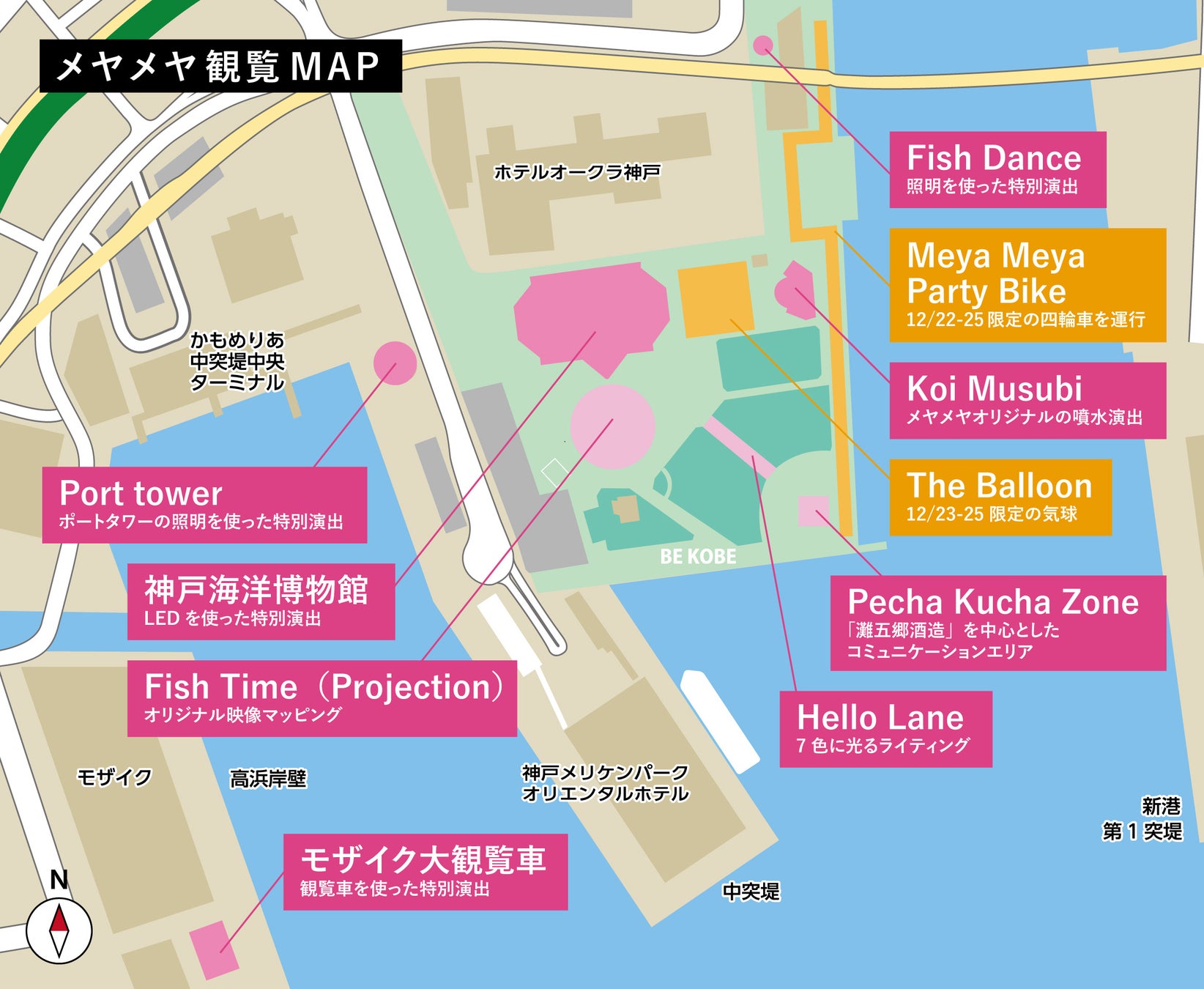 「メヤメヤ」とは、100年後に「メヤメヤ」という言葉が意味を持つことを願って、メリケンパークの頭文字「メ」と「夜=ヤ」でつくった造語です。冬の夜に神戸ウォーターフロントエリアに現れる世界を表現し”もやもや”する新しい感情のはじまりに光をあて、自分のなかにある「なにか」を探しに出かける航海の入り口です。