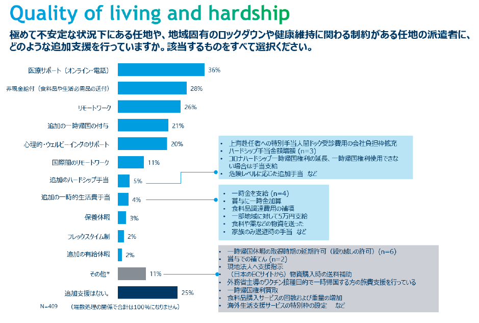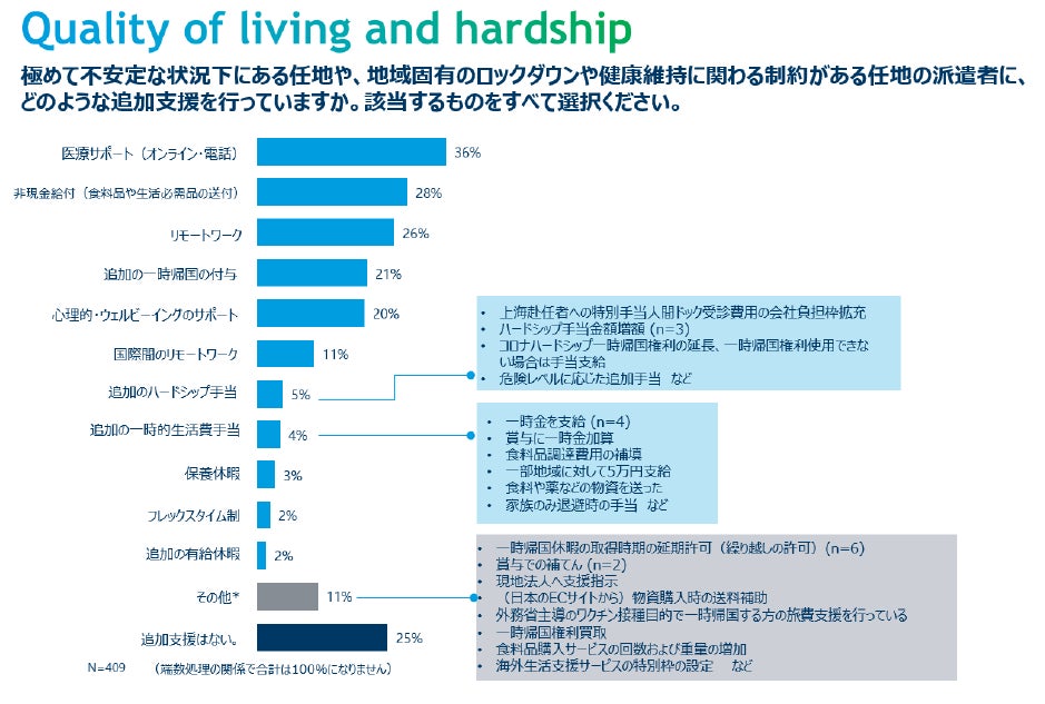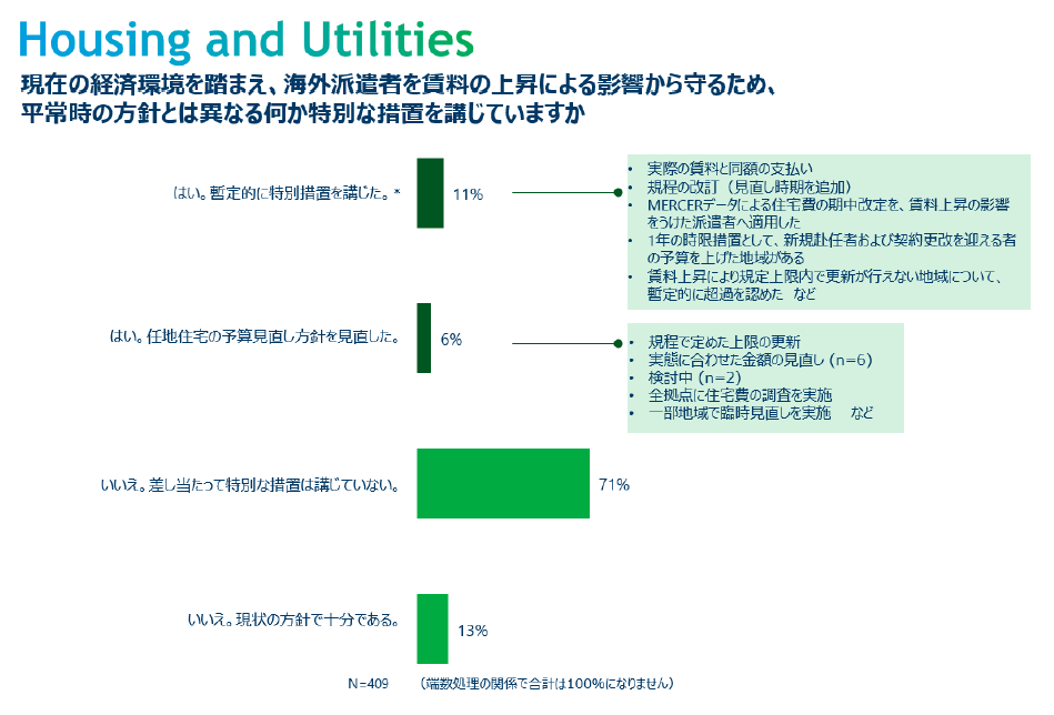 マーサーは、クライアント企業が従来のモビリティポリシー・運用ルールに沿って対処しているのか、あるいは臨時的措置を講じたのか、グローバル規模で実例を収集した。調査はマーサーの生計費指数、生活環境指数等のデータを利用している企業を対象に、2022年12月15日-31日に実施し、409社の日本企業から回答を得た。