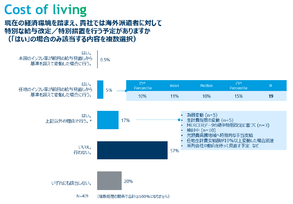 ・現在の経済環境を踏まえ、「給与改定/特別措置を行う予定がありますか」という質問に対して、「行わない」と回答している企業は57%だった。一方、特別措置を行う場合は、「海外勤務手当に上乗せ」「直近の指数を確認し、指数の変動度合に応じて臨時改定」等が回答された