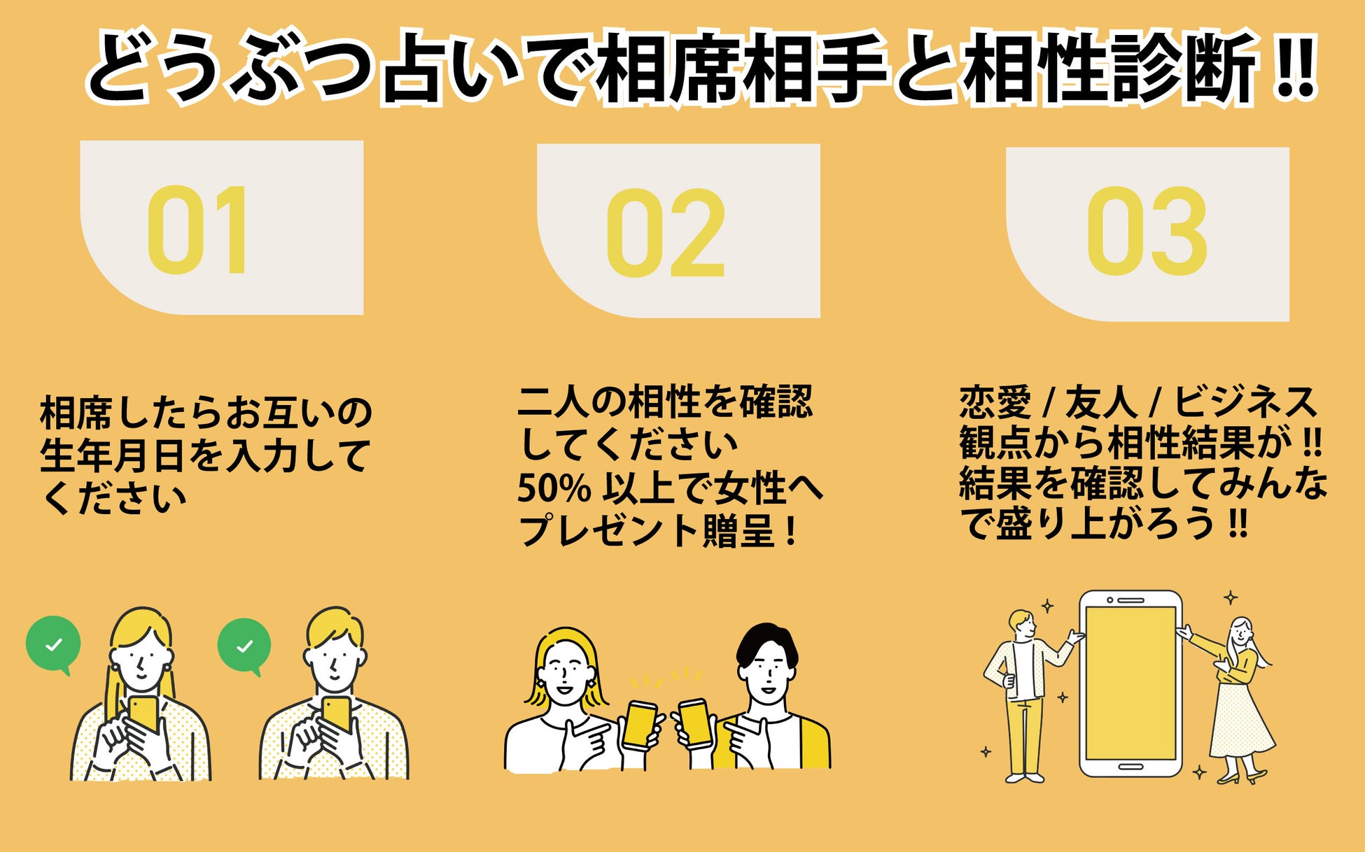 今回、生年月日を利用した動物占いによって、相席相手と相性診断をすることができます。相性が50%以上の場合、フェイスパックやバスソルトセットなどのノベルティをプレゼント致します。また、相席屋をご利用いただいたお客様は、退店後に個性心理學研究所さまで行っている個別の性格診断が受けられるようになっています。