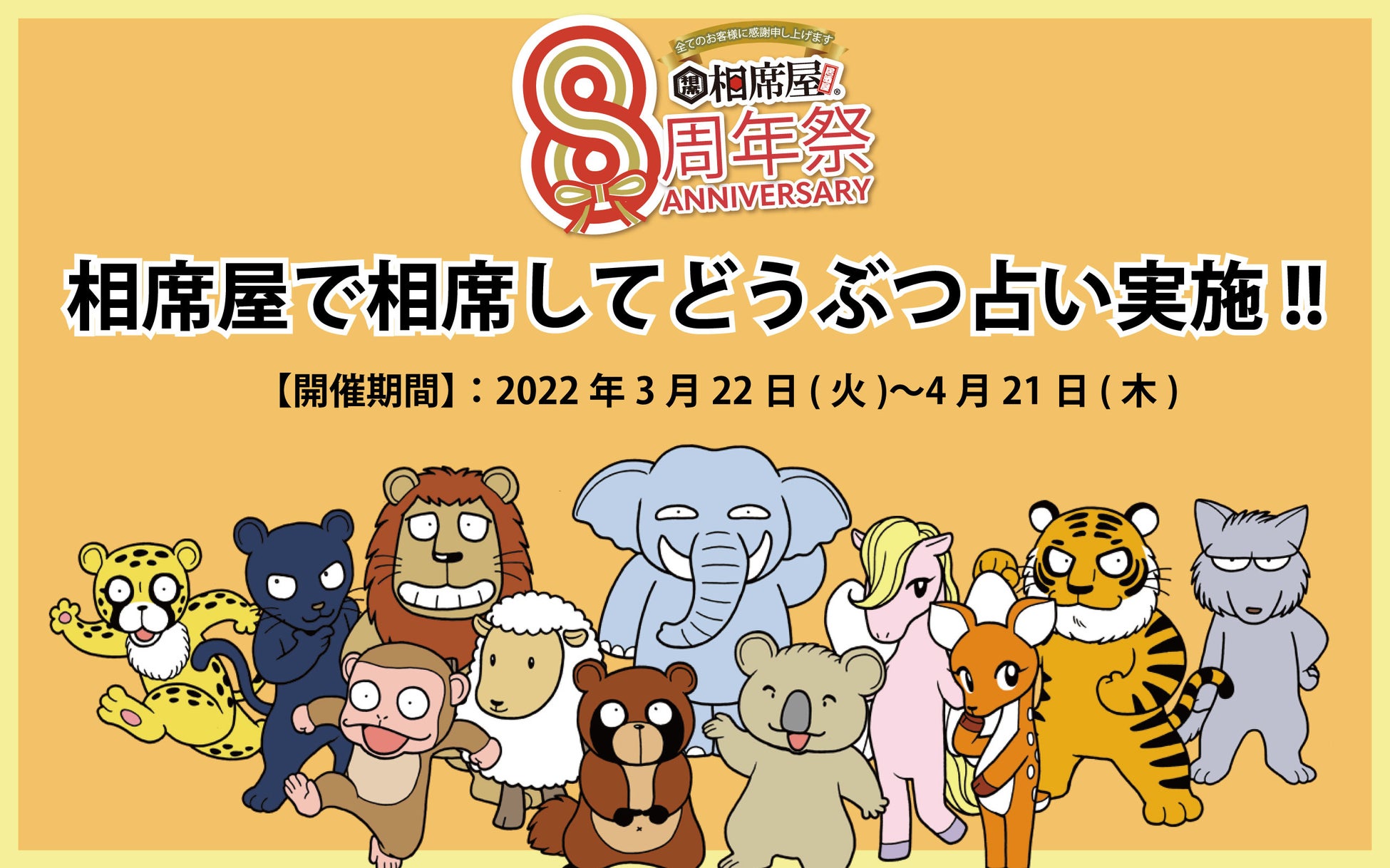 相席屋8周年、たくさんのご縁の輪(∞)をありがとう!ご縁の輪(∞)に因みどうぶつ占いで相席相手との相性を診断!相席屋8周年イベントを2022年3月22日より開催