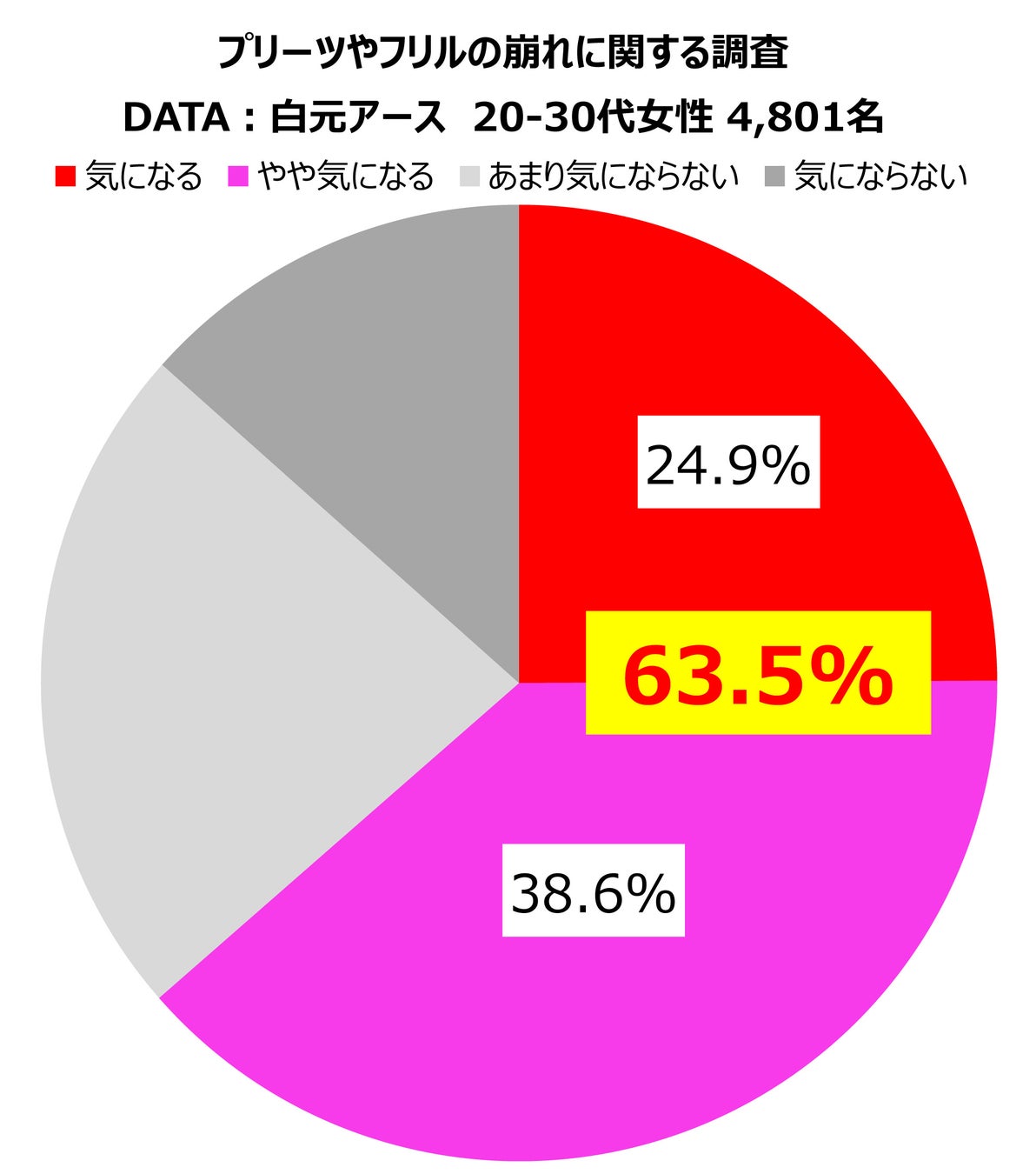 スカートのプリーツやパンツのセンターライン、ブラウスのフリルは、着用や収納により形が崩れていき、そのままにしていると周囲に「だらしない」「清潔感がない」といった印象を与えてしまうこともあります。今回、当社が独自に調査したところ、6割以上の方がプリーツやフリルの崩れを気にしていることが分かりました(下図参照)。