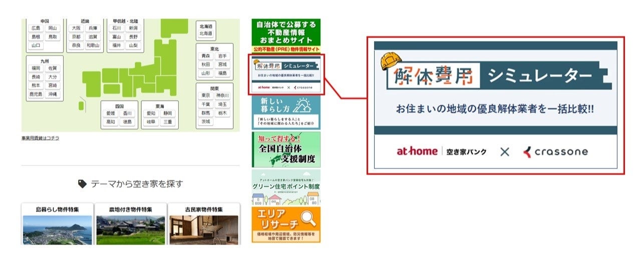 連携イメージ:「アットホーム 空き家バンク」のTOPページに「解体費用シミュレーター」のバナーを設置