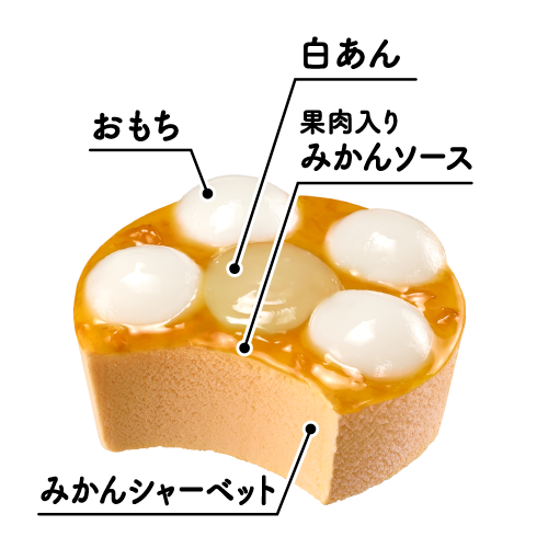みかんシャーベットとみかんソース、白あん、おもちを重ね合わせ、まるで和菓子屋のみかん大福のような味わいを表現しました。みかん原料には国産温州みかんのみを使用。みかんシャーベットは氷菓規格にすることで、夏でもすっきりと食べられます。みかんソースには国産温州みかん果汁・果肉を45%配合し、みずみずしくジューシーな味わいに仕上げました。