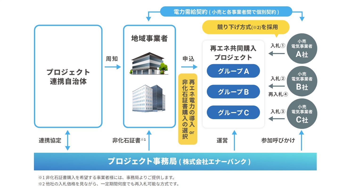 当社が提供する電力リバースオークションサービス「エネオク」や非化石証書の仲介販売サービスの「グリーンチケット」といったソリューションを活用しながら、再エネを安価に提供することによって、民間事業者の脱炭素化に向けた取り組みを支援します。地域の事業者が共同でオークションを実施することによって、電気小売事業者からスケールメリットを引き出し、環境負荷の低い電力契約と経済性を両立することにより、再エネ導入を促します。