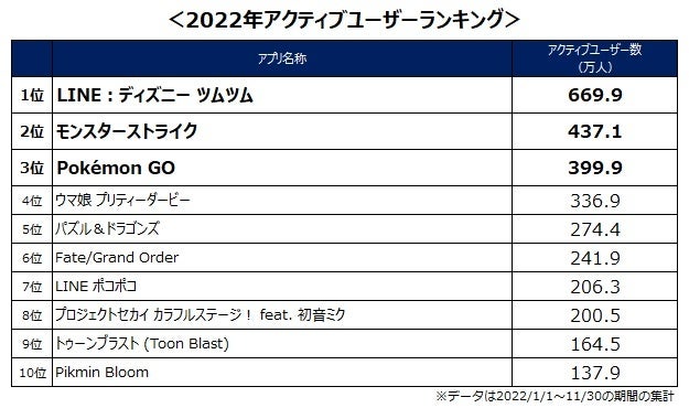 最もユーザー数の多かったアプリは『LINE:ディズニーツムツム』の669.9万人。2位のアプリと比べると、230万人以上差をつけています。人気不動のIPと、スキマ時間などを利用してカジュアルに遊ぶことのできる点が、アクティブユーザーの獲得/維持に大きく影響を与えていると考えられます。