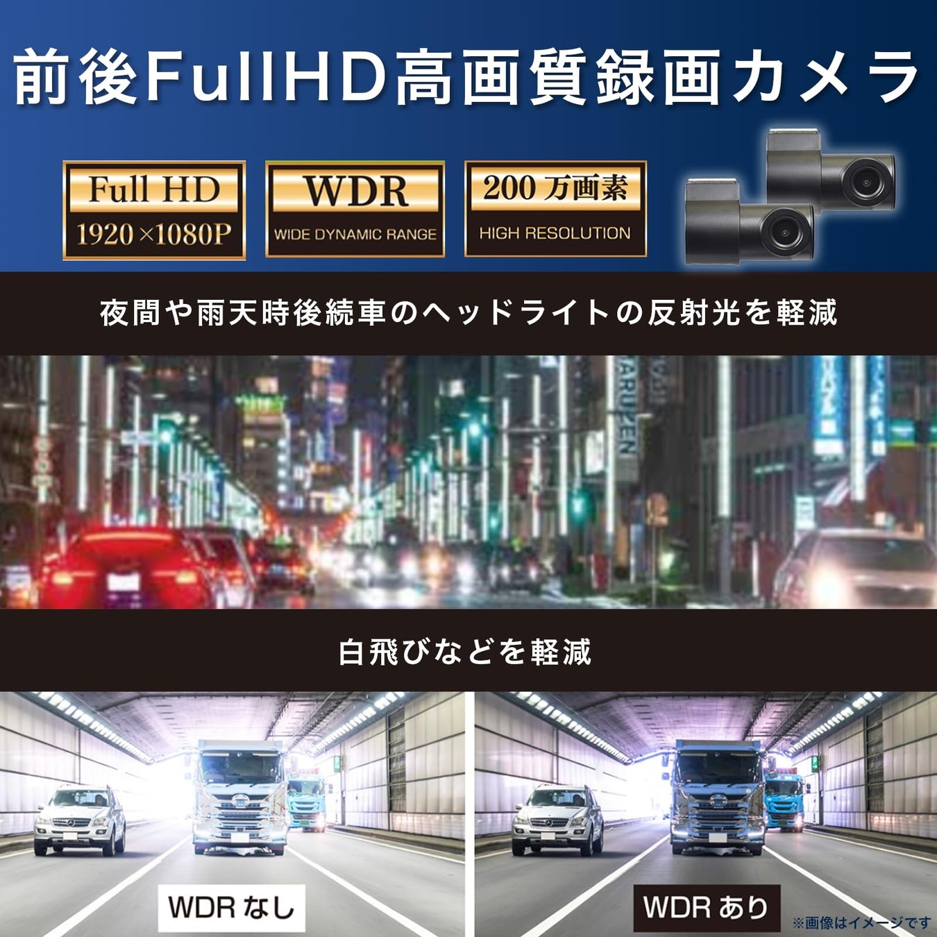【前後フルHDドライブレコーダー+デジタルバックミラー】前後2 つのカメラで高画質同時録画をし、しっかり後方確認もできます。同乗者や荷物などで視界が遮られる場合や、雨天や夜間など視界が悪くなる場合など、後方視界確保が困難になる場面で車両後部に取り付けた200 万画素の高質リアカメラが、クリアで広範囲な映像で運転をサポートします。