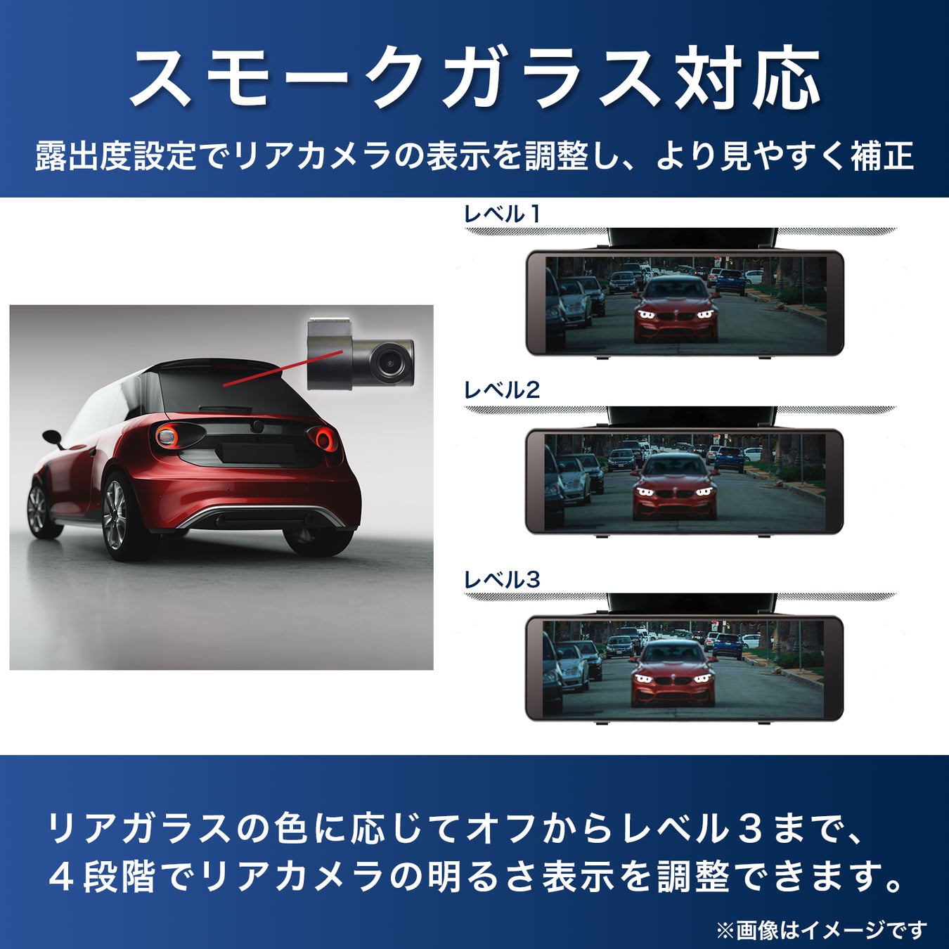 【スモークガラス設定搭載】お車のリアガラスに色がついている場合でも、露出度を設定することでリアカメラの明るさを調整し、より見やすく補正することができます。(露出度設定は、オフ、Lev1~Lev3の4段階から設定いただけます。)