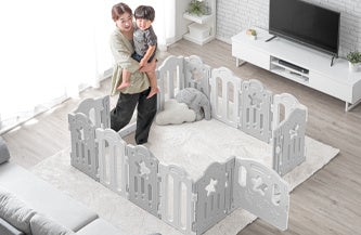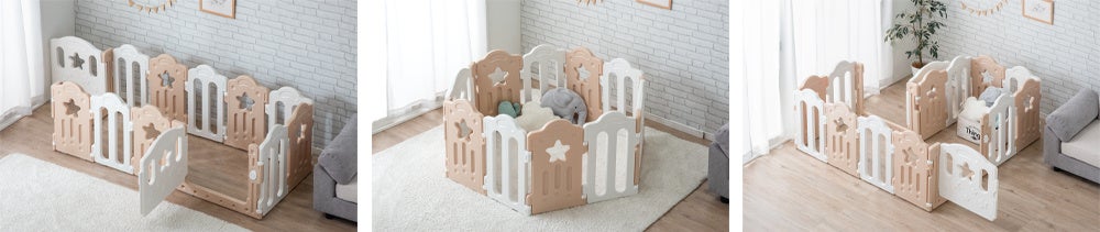 軽量素材の高密度ポリエチレンを使用しているため、ベビーサークルのパネルの解体、組み立てや移動がしやすいつくりとなっています。また、お部屋の広さや生活導線に合わせて、長方形や六角形・L字型など形やサイズを自由に組み替えられるところもポイントです。