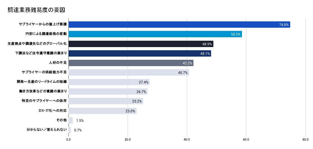 ・調達業務の難易度が高い理由、約4分の3が「サプライヤーからの値上げ要請」と回答。「円安」「グローバル化」「下請法」への対応も影響あり。