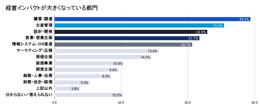 ●近年経営インパクトが大きくなっている部門は、「購買・調達」が29.4%で1位となり、続くのは「生産管理」「設計・開発」。