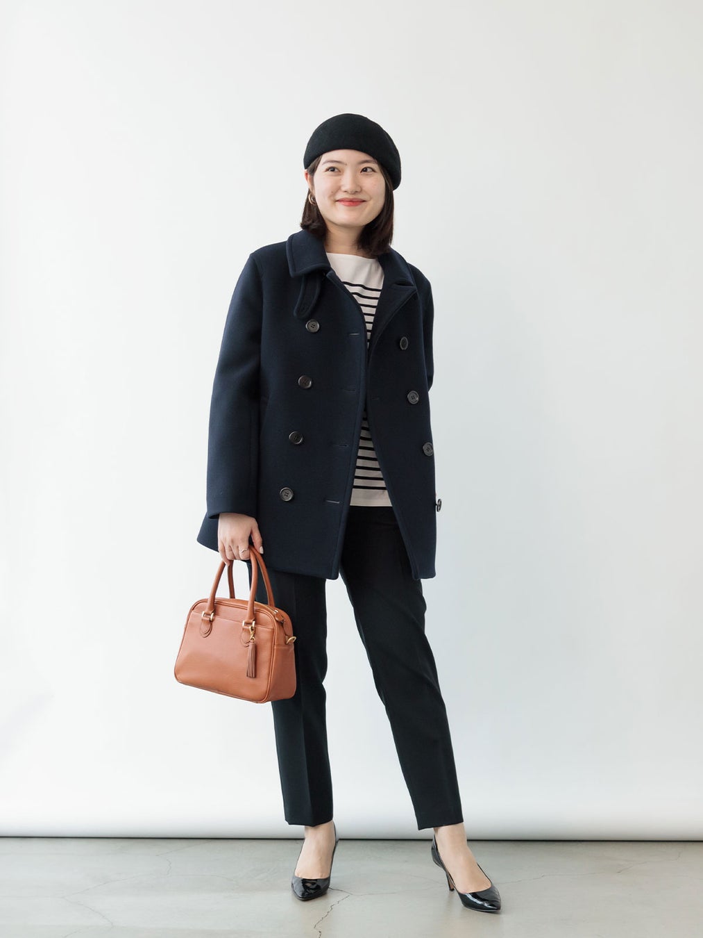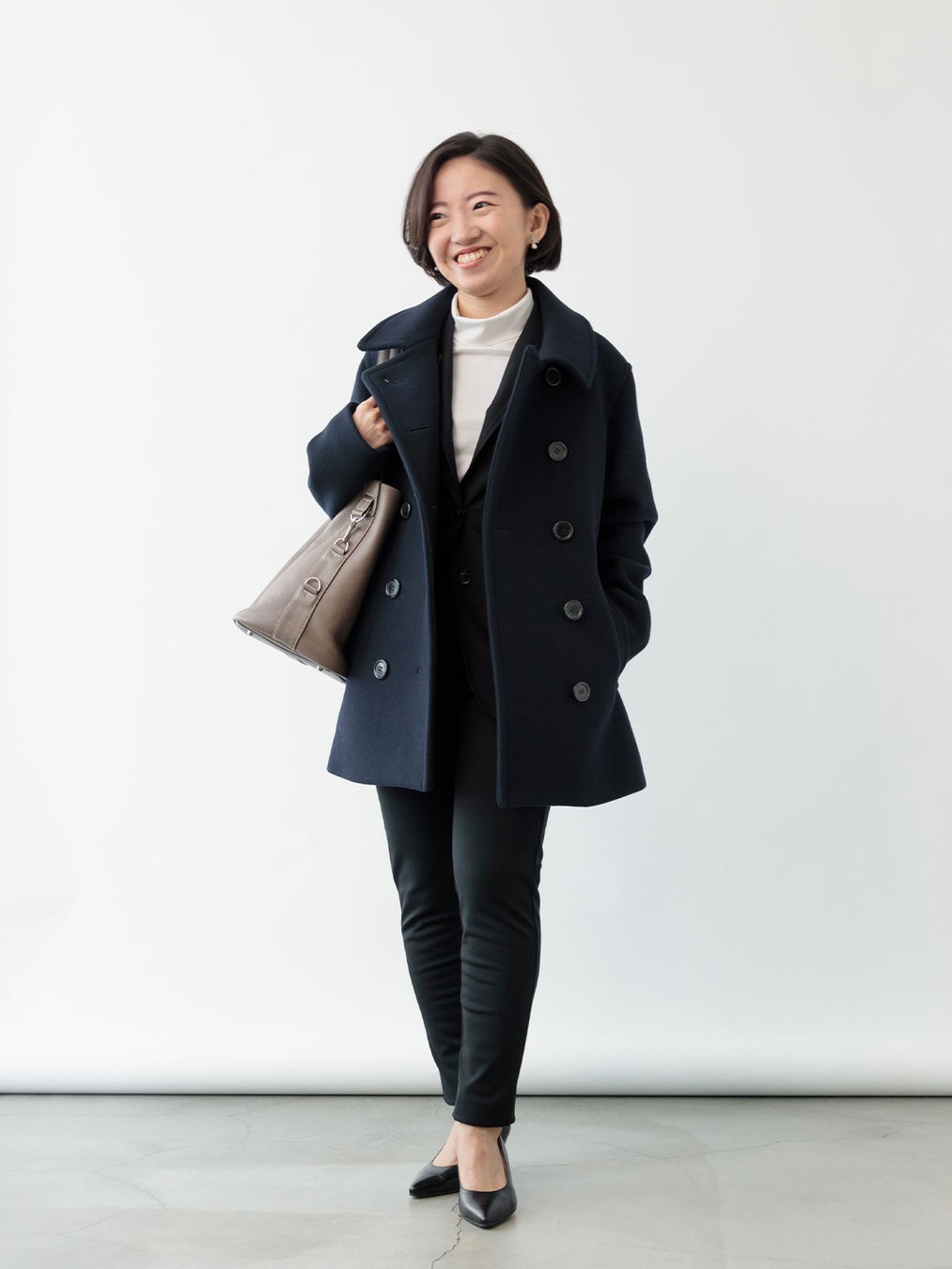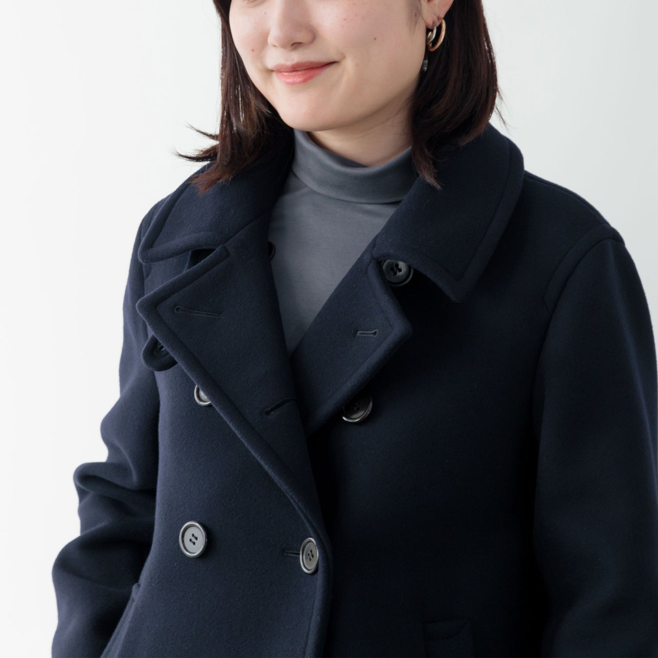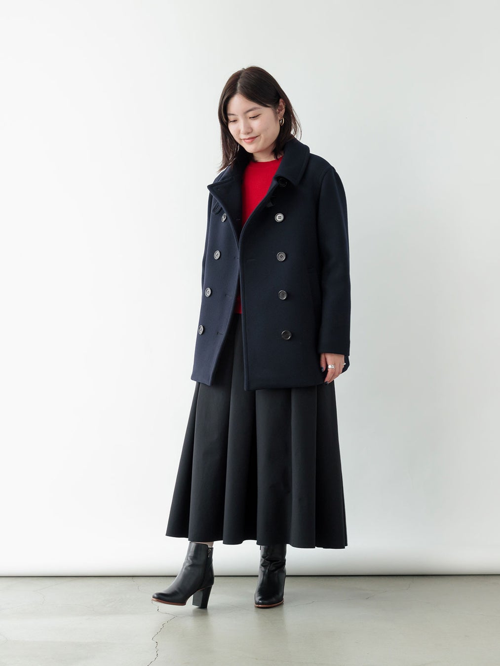 ロングコートほどかしこまりすぎないミドル丈のピーコートは、着回しの幅が広いのも特徴。