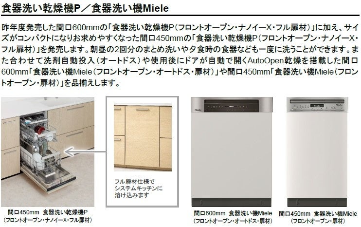 そのほか、これまでの間口600mmに加えてサイズがコンパクトになった間口450mmの「食器洗い乾燥機P(フロントオープン・ナノイーX・フル扉材)」、洗剤自動投入(オートドス)などの機能を搭載した間口600mm「食器洗い機Miele (フロントオープン・オートドス・扉材)」の他、間口450mm「食器洗い機Miele(フロントオープン・扉材)」など、人気のフロントオープン食洗機の品揃えを拡充します。また「フック式ツールスタンド」や「仕切り付きバー」で収納機能を充実させました。