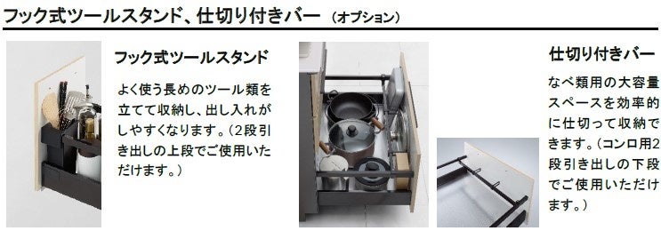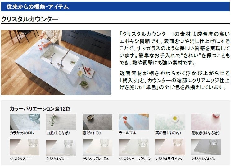 ①お求めやすい価格帯に扉カラー新色2色「フォスダークグレー」「フォスグレー」追加 ②マグネット収納が取り付けられ、汚れがふき取りやすい「マグネット対応パネル」追加 ③調理家電が手軽に使用できる「コンセント付き2段引き出し」追加 ④食器洗い乾燥機P・食器洗い機Miele品揃え ⑤「フック式ツールスタンド」・「仕切り付きバー」のアイテム追加で収納機能を充実 |
