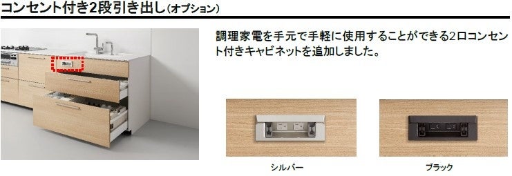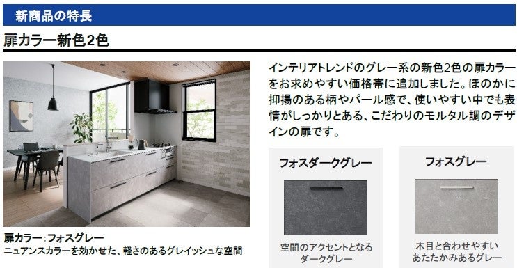 今回は、インテリアトレンドであるグレー系の扉カラーをお求めやすい価格帯に2色追加します。空間のアクセントとなる「フォスダークグレー」と木目と合わせやすいあたたかみある「フォスグレー」を品揃えしグレイッシュな空間を実現します。また、キッチンパネルにはマグネット収納を取り付けられ、汚れもふき取り やすい「マグネット対応パネル」や調理家電が手元で手軽に使用できる「コンセント付き2段引き出し」などのアイテムを追加します。
