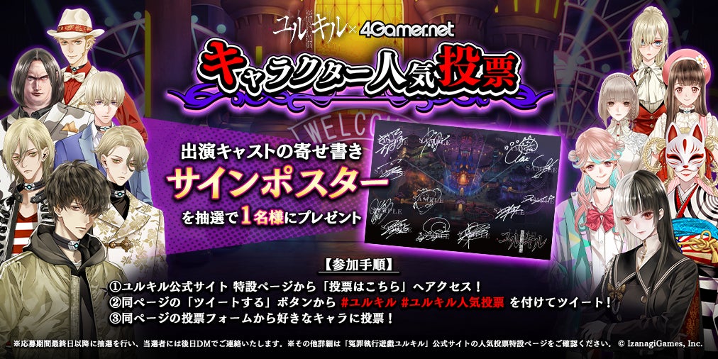 4Gamer.netとのコラボイベント【冤罪執行遊戯ユルキル X 4Gamer.net】『第1回ユルキルスコアタキャラバン』及び『ユルキルキャラクター人気投票』を開催いたします。