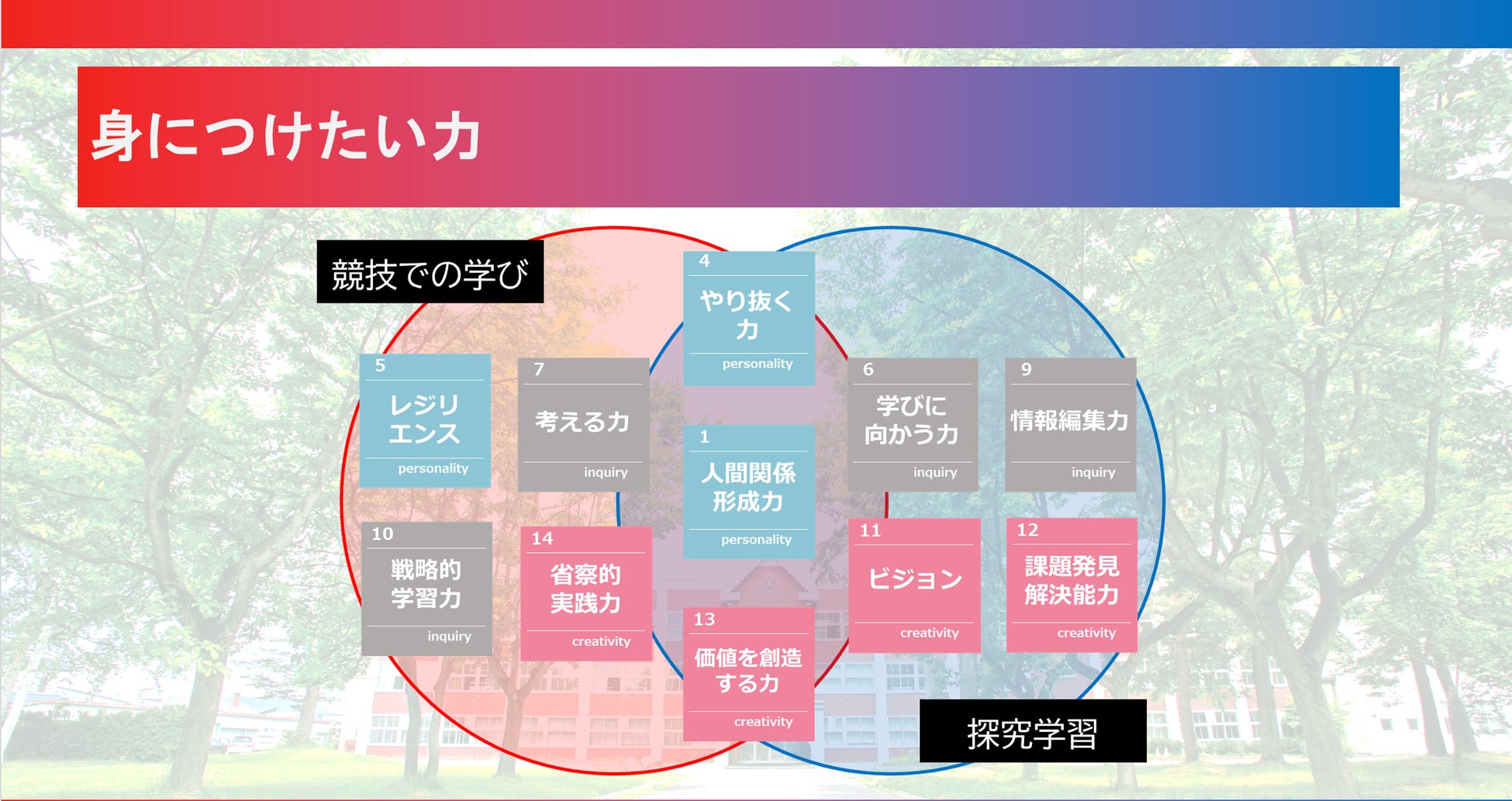また、クラーク国際では、生徒が将来にわたって活躍できるように、「15のコンピテンシー(資質・能力)」を育成の柱としています。とりわけ、競技での学びと探究学習が重なり合うことで養われる「やり抜く力」「人間関係形成力」「価値を創造する力」の3つを中心に、その他の力もバランスよく伸ばしていきます。