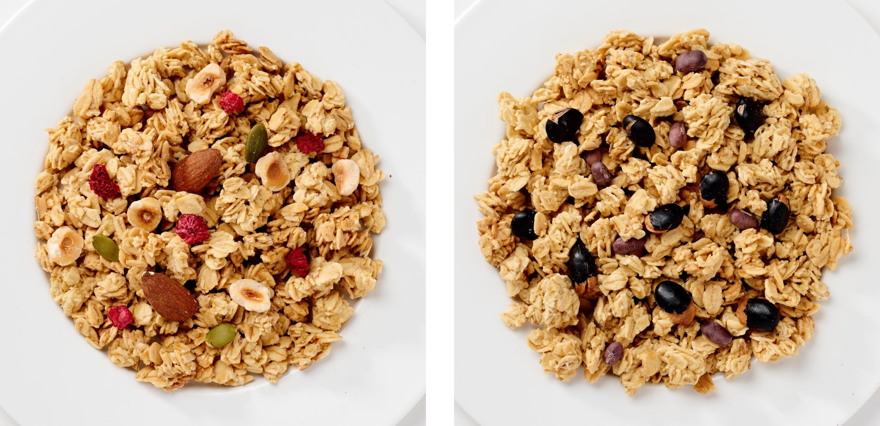 ヨーロッパ産の全粒オーツ麦をはじめ、トルコ産のヘーゼルナッツ、北海道産の黒豆・小豆など産地にこだわった具材を贅沢にたっぷり使用しており、具材には加糖などの加工をしていないため、素材そのものの味をお楽しみいただけます。
