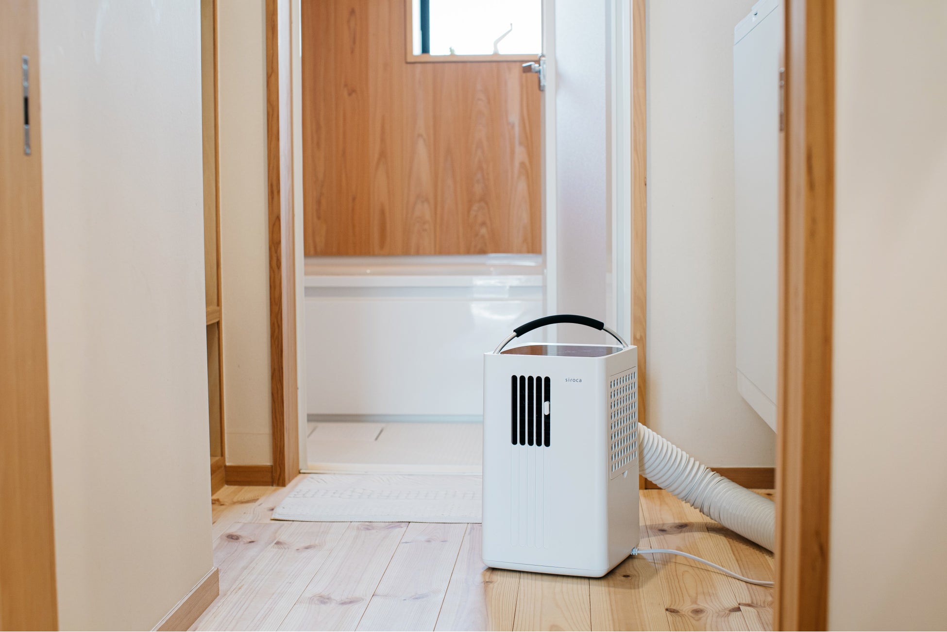 テレワークやオンライン授業など、家族がそれぞれの場所で過ごす時間も多い中、本製品は工事不要かつ持ち運びやすいサイズのため、涼しさを欲しいときに欲しいところへ持ち運んで使うことができます。脱衣所やキッチンなどの工事が難しい狭い場所でも、本製品で涼しく快適な空間づくりをサポートします。また、1日4.4Lの除湿ができる除湿機能付きで、一年を通してお使いいただけます。