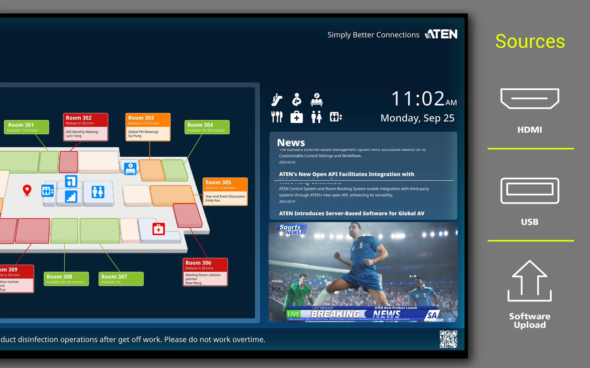ディスプレイと接続するHDMI出力は、最大4Kの高解像度に対応し、プロ用途に応える性能と、操作のしやすさを兼ね備えています。企業や教育機関、会議施設、ホスピタリティ分野など、様々な会議室エリアの案内表示に利用できる製品です。