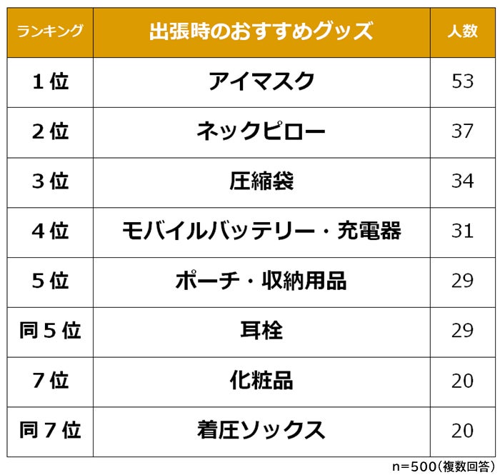 男女500人にアンケートを行ったところ、「出張時のおすすめグッズ」第1位は「アイマスク」でした。