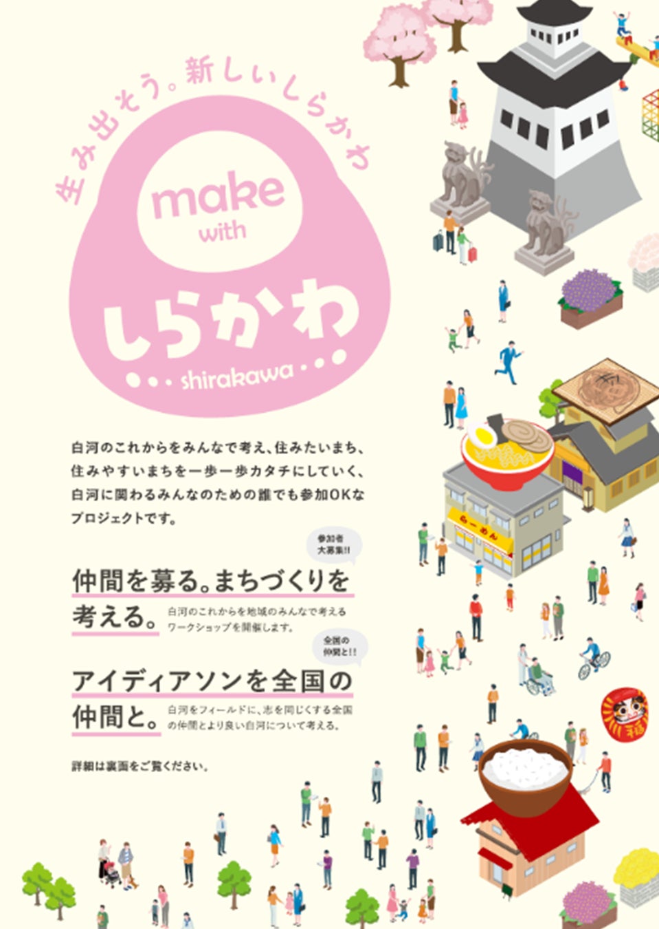 この度、本事業の一環として白河市にお住いの住民の方、白河市に通学、通勤をしている方など、白河市にゆかりのある人たちを対象として、白河市が有する地域特性を参加者それぞれの視点から発信、共有しながら、白河市の地域特性を可視化し、地域特性を活かした活動や必要な事業を考えるワークショップ「Make with Shirakawa(以下、本ワークショップという。)」を開催します。