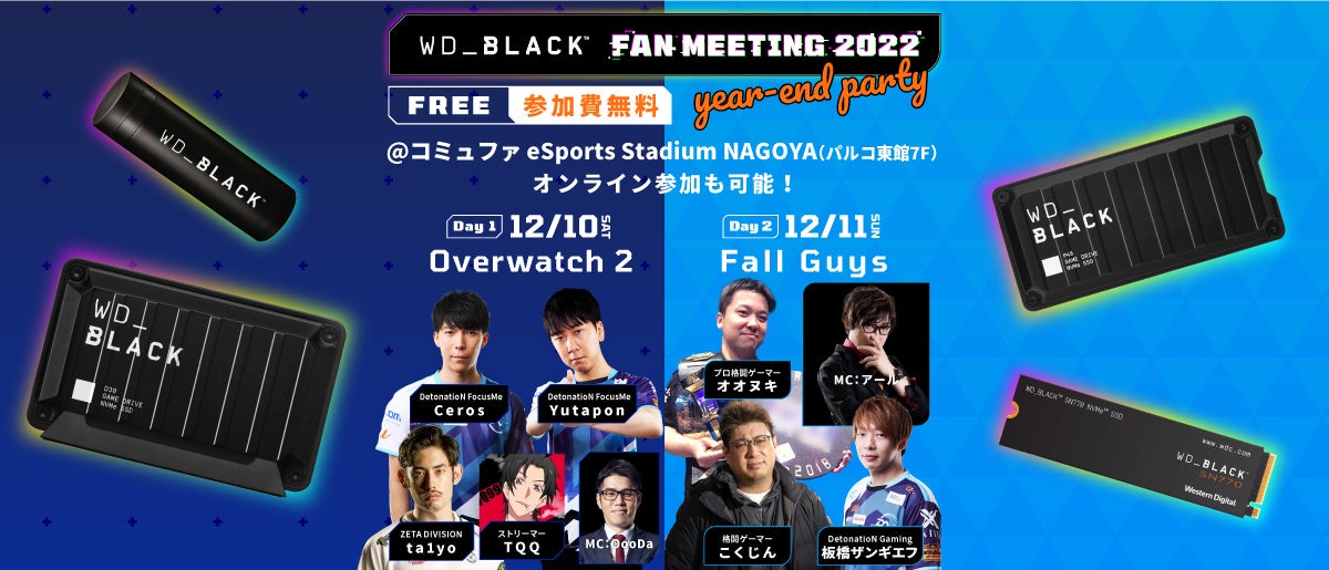 ウエスタンデジタルは、多くのゲーミングファンに支えられるWD_BLACKブランドの更なる認知を高めるために、2022年12月10日(土)・2022年12月11日(日)、『WD_BLACK FAN MEETING year-end party』を、愛知県名古屋市のeスポーツスタジアム”コミュファ eSports Stadium NAGOYA”で開催します。今回で第3回目のWD_BLACK FAN MEETINGとなります。