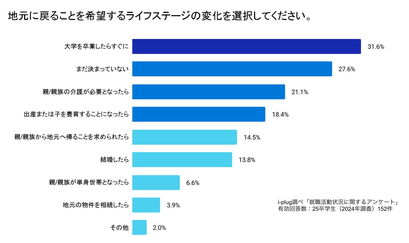 地元に戻るタイミングに関する設問では、「大学を卒業したらすぐに」が最多の31.6%でした。また「親/親族の介護が必要となったら」「親/親族から地元へ帰ることを求められたら」「親/親族が単身世帯となったら」といった、「家族」に関する項目を選択した25卒学生は全体の42.2%。自分自身のライフステージではなく「家族」が、地元に戻ることを希望する大きな理由となっていることが推察できます。