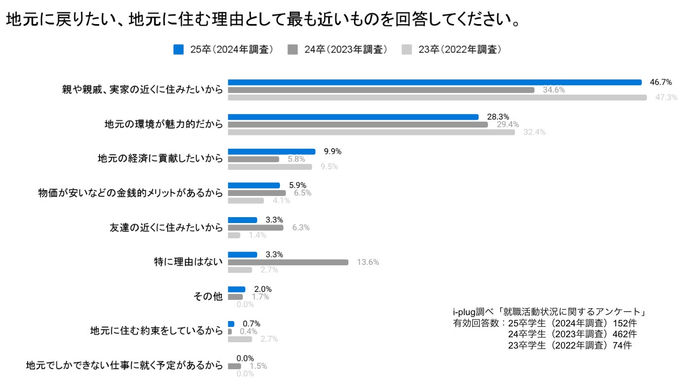 地元に戻ることを希望する理由として、「親や親戚、実家の近くに住みたいから」との回答が最多の46.7%。昨年、24卒学生に実施した調査と比較すると12.1ポイント増加しました。
