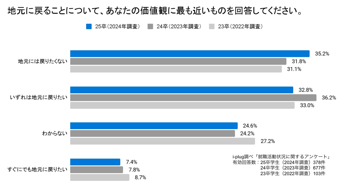 昨年の24卒学生、一昨年の23卒学生の結果とは異なり、25卒学生は「地元には戻りたくない」の回答が最多の35.2%でした。また、「すぐにでも地元に戻りたい」「いずれは地元に戻りたい」と回答した学生と合わせて、「戻りたい」と考える25卒学生は40.2%でした。
