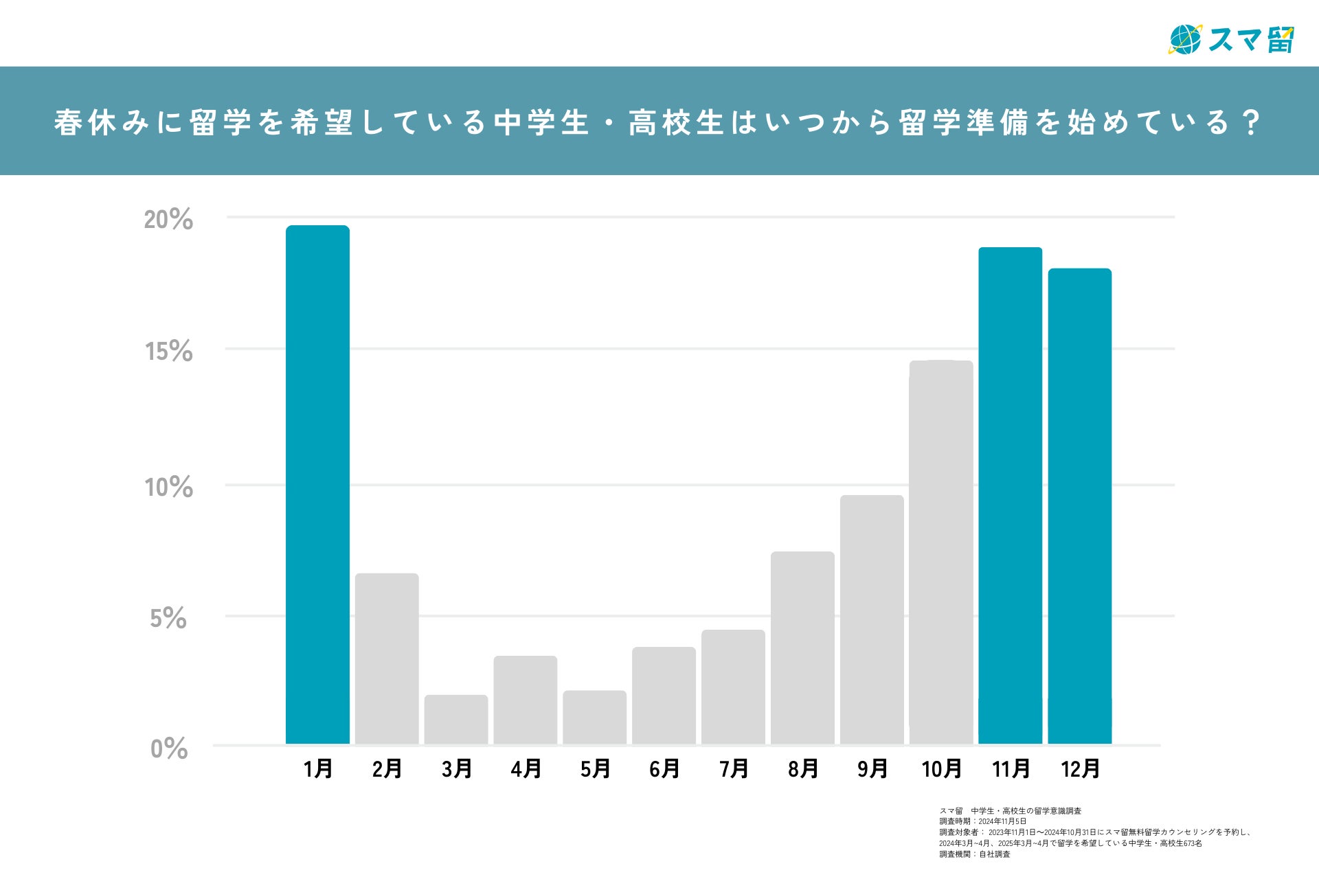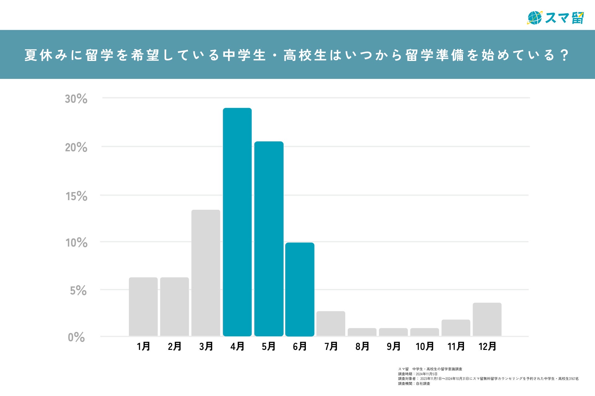 「Make The World Your Stage .」をブランドフィロソフィーに掲げ、海外留学エージェント『スマ留』を運営する株式会社リアブロード(本社:東京都渋谷区、代表取締役社長:神田慎)は、2023年11月1日~2024年10月31日の中学生・高校生の留学希望者を対象に海外留学に関する意識調査を実施しました。今回の調査では、夏休みの留学に次いで春休みに留学をする人が多いという結果となりました。また、夏休みの留学は3〜6月に留学の準備をはじめ、春休みの留学は9月から徐々に増え1月に最も多くの方が留学準備を始めるということが分かりました。