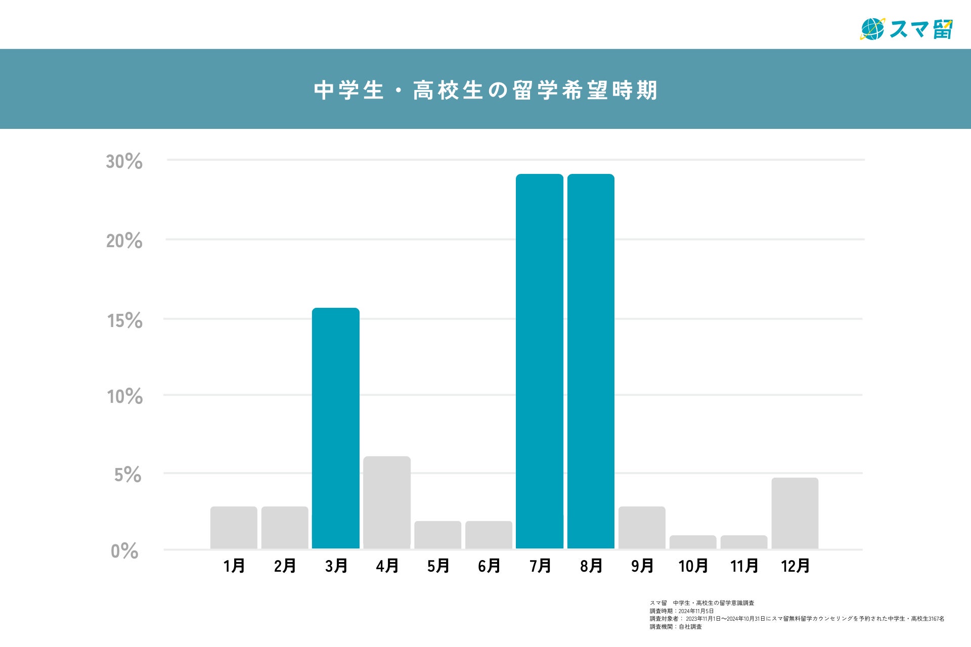ー中学生・高校生の留学希望時期は夏休みと春休みが最も多いという結果に。春休み留学希望者は11月から1月をピークに留学準備を始めるー