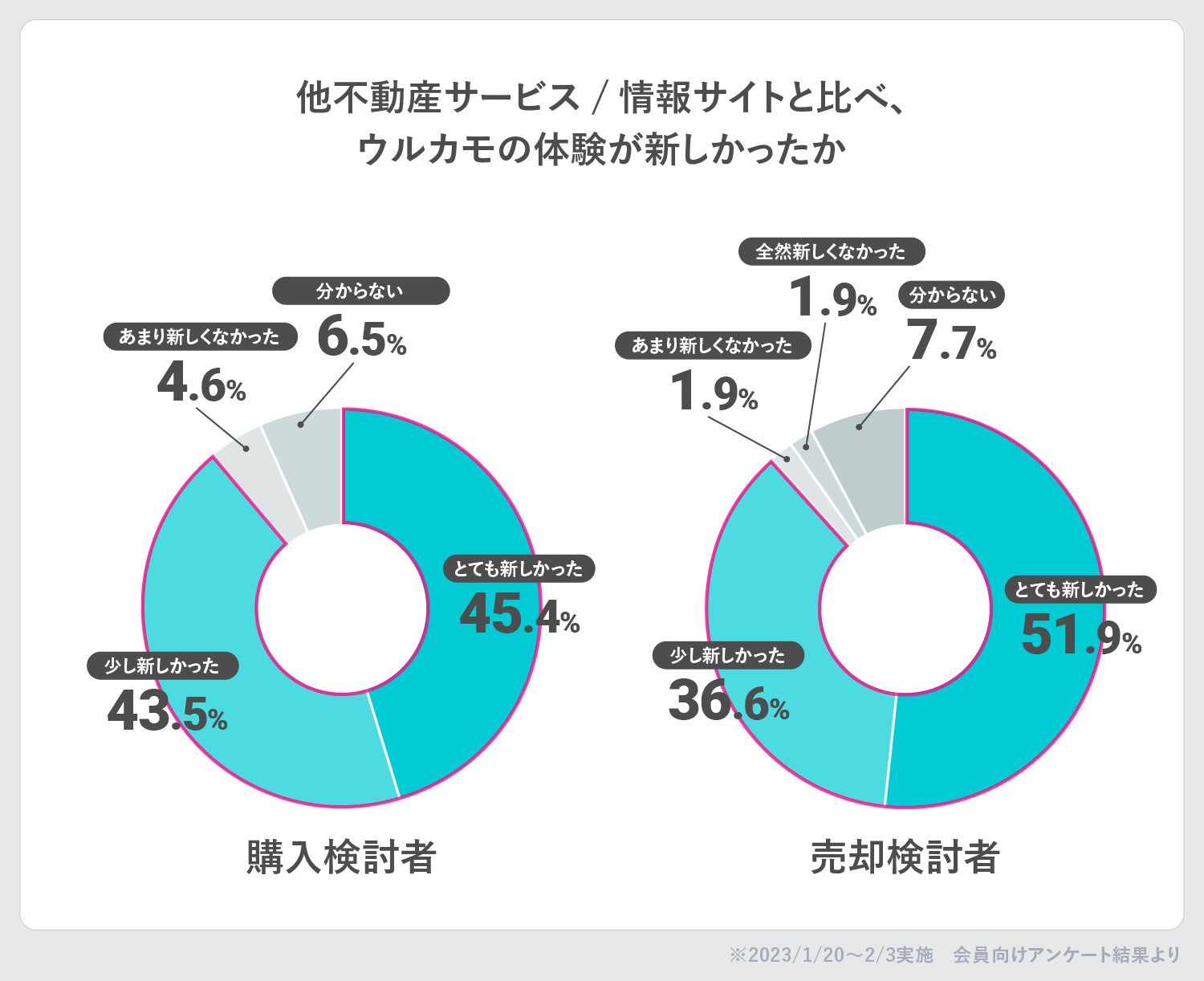 ウルカモを利用する購入検討者108名、売却検討者52名に聞いたところ、購入検討者の88.9%、売却検討者の88.5%が「ウルカモの体験は新しい」と評価しました。