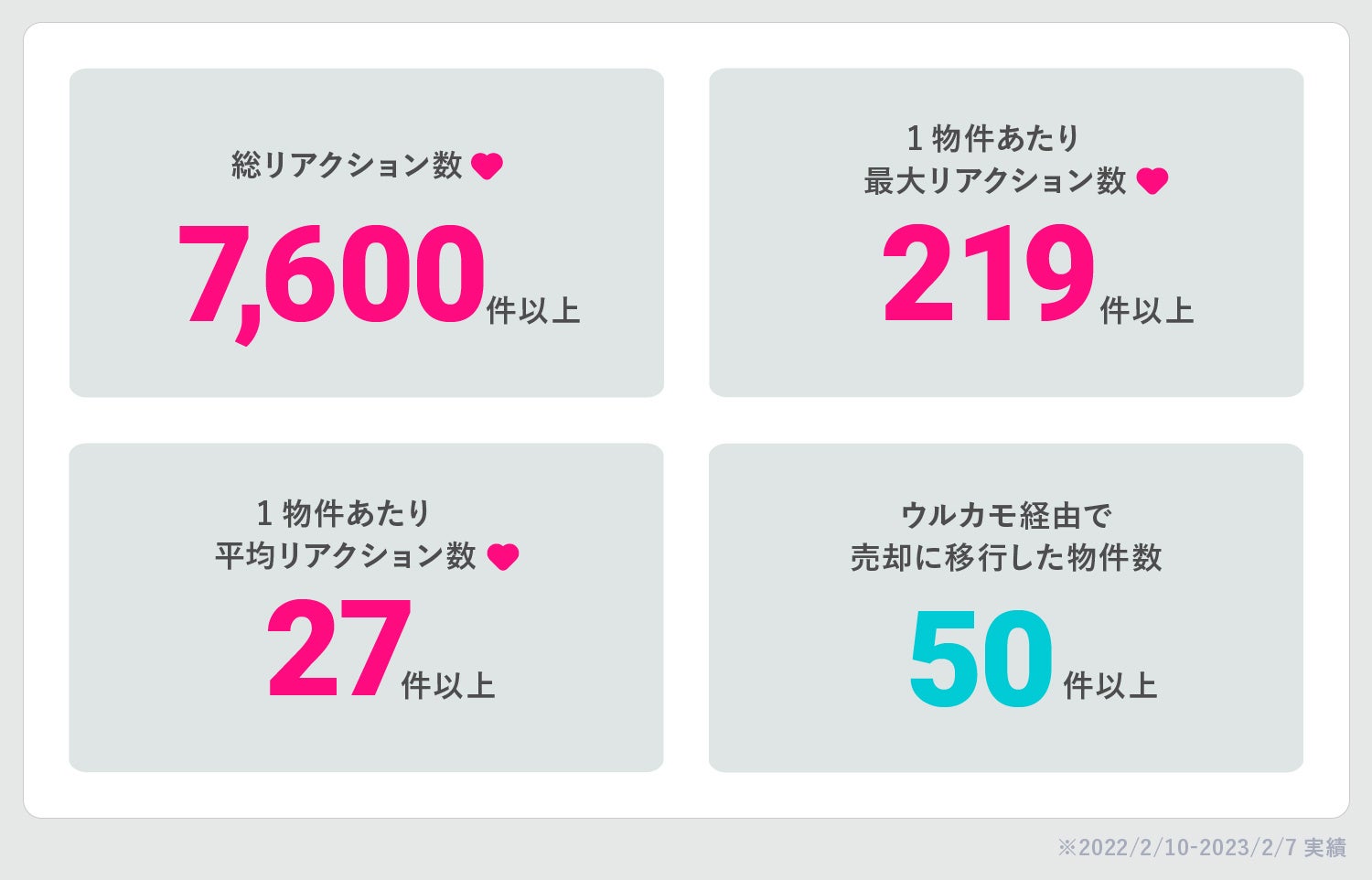 この1年の総リアクション数は7,600件以上で、1物件あたり最大のリアクションは219件、平均は27件でした。ウルカモを使って売却について検討した結果、実際に売りに出された(売却に移行した)物件は50件以上となりました。