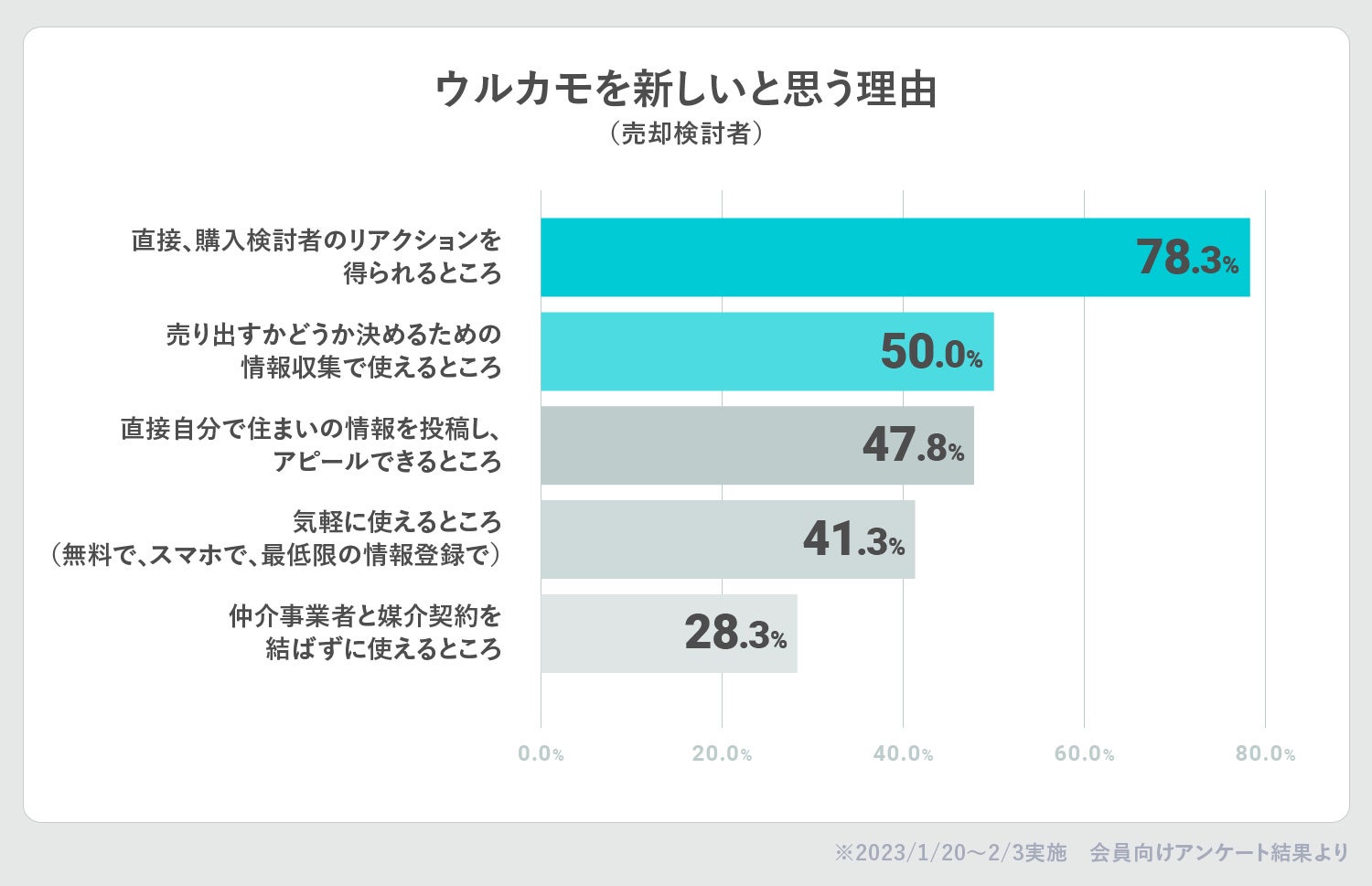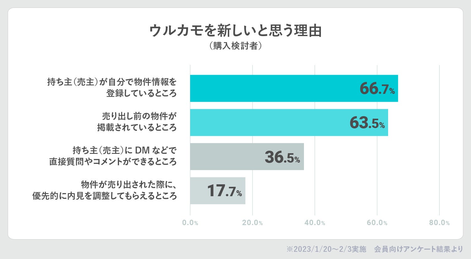 購入検討者が新しいと感じる理由の上位は、「持ち主(売主)が自分で物件情報を登録しているところ」(66.7%)、「売り出し前の物件が掲載されているところ」(63.5%)でした。売却検討者が新しいと感じる理由の上位は、「直接、購入検討者のリアクションを得られるところ」(78.3%)「売り出すかどうか決めるための情報収集で使えるところ」(50.0%)でした。