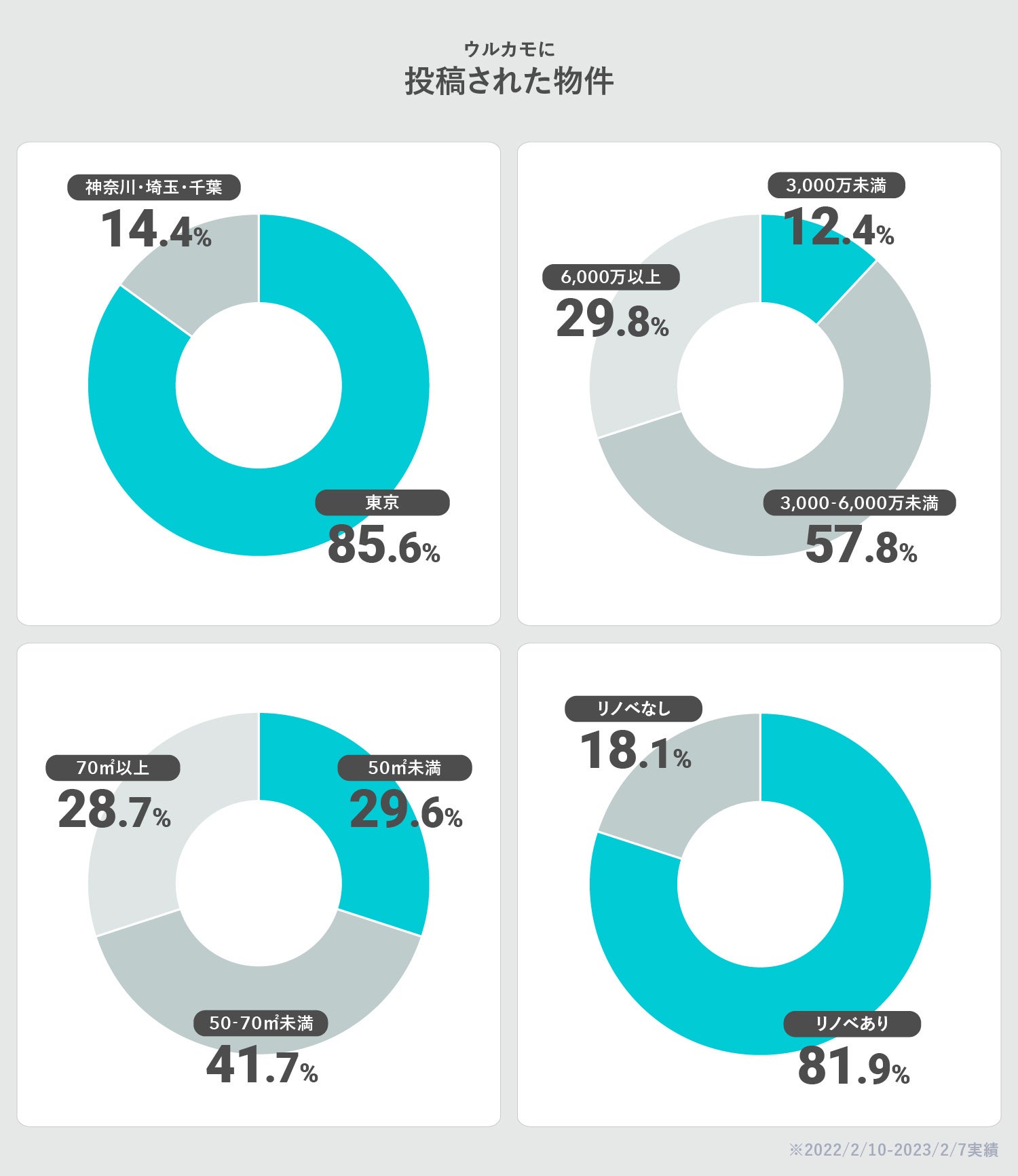 投稿される物件の傾向から、現時点のウルカモは、東京でリノベーション済マンションを探す方で、掘り出しもの(まだ売りに出される前の物件)を見つけたい方に活用いただきやすいラインナップになっています。